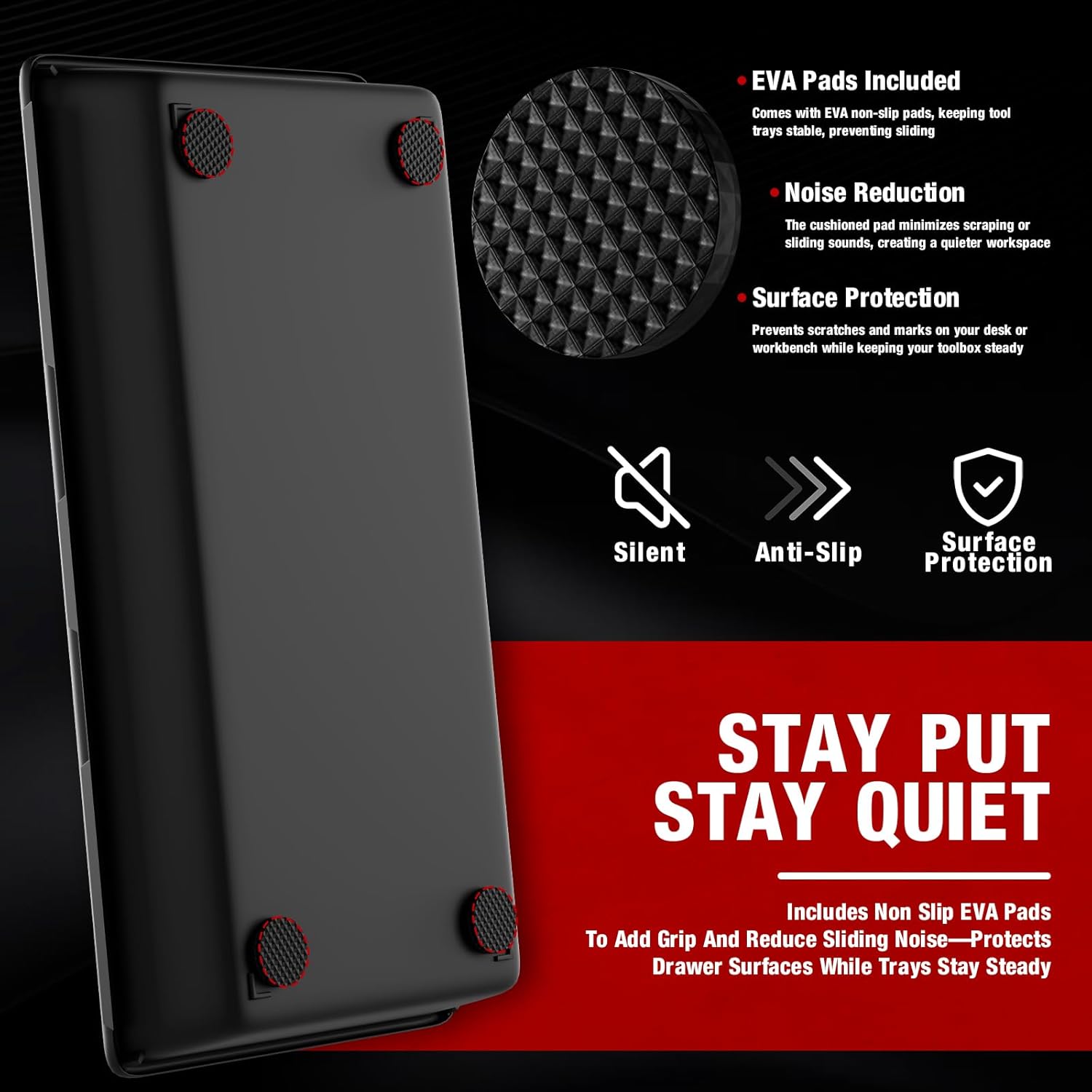 EVA Non-Slip Pads are a core feature. XS includes 1 pad, other sizes 4 pads. They provide stable grip and prevent trays from sliding on workbenches, drawers, or shelves.