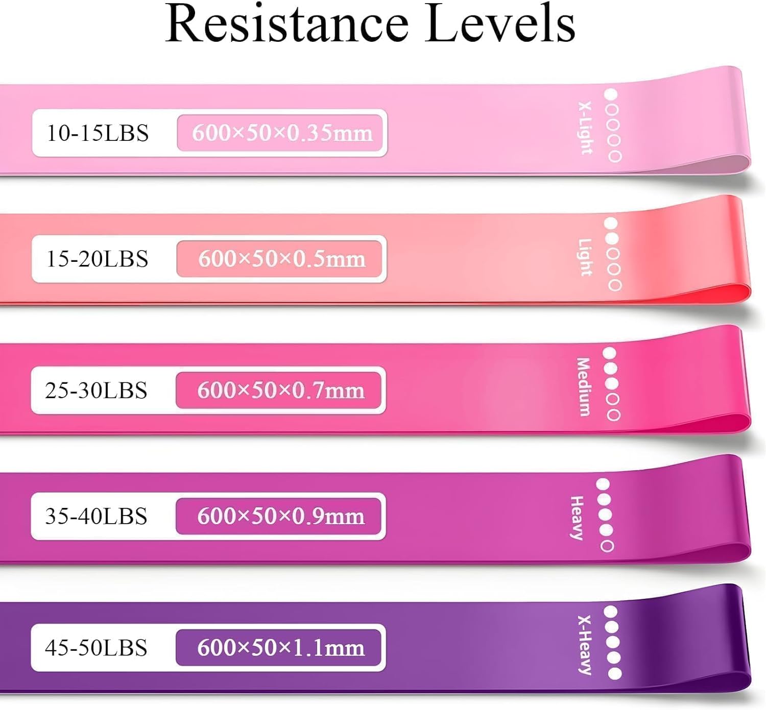 Resistance Levels: These resistance bands come in five different levels of resistance: X-Light, Light, Medium, Heavy, and X-Heavy, catering to users from beginners to advanced fitness enthusiasts
