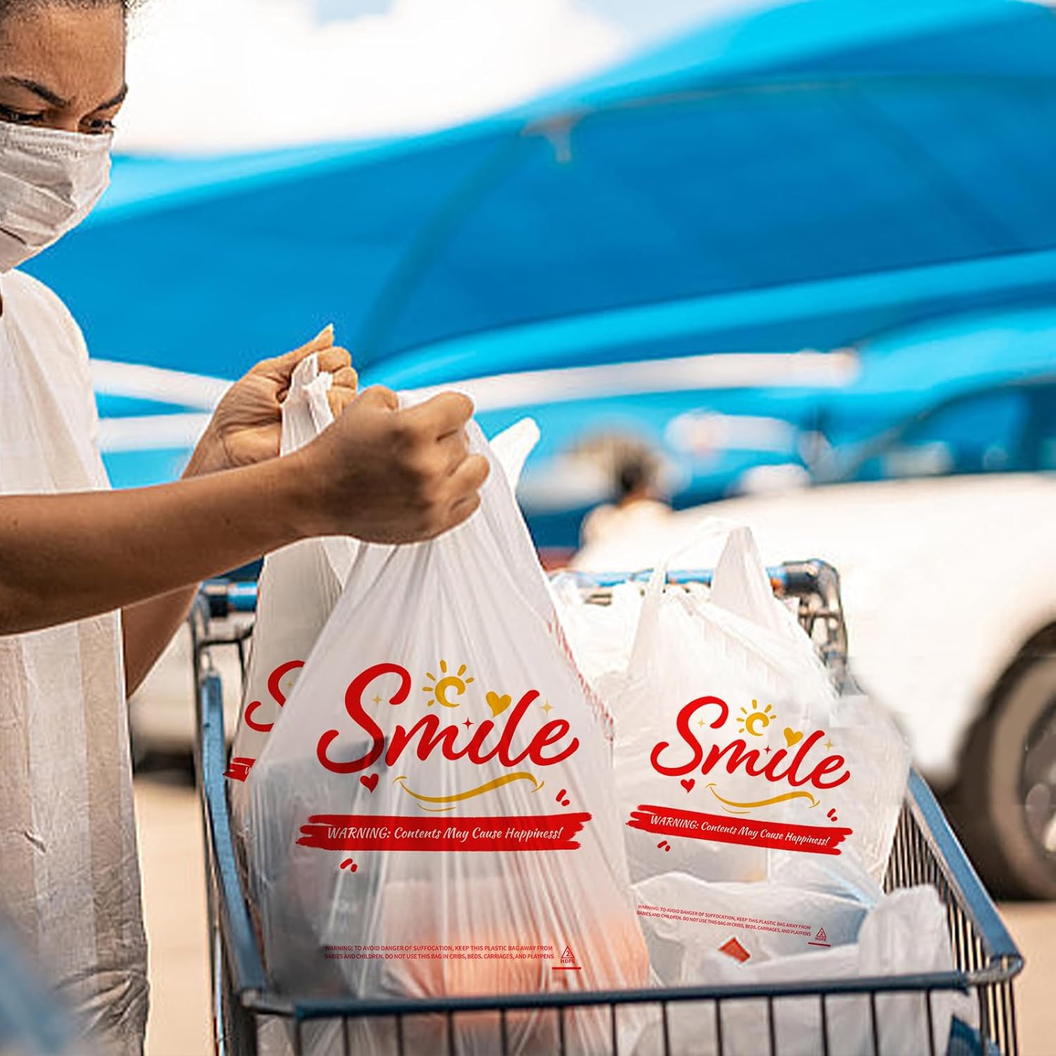 8 reviews for 100 Pack White Smile Plastic Bag – 11.5″x6.5″x21″ T-Shirt Grocery Bags with Handles, Cheerful Alternative to Thank You Bags, Bulk for Retail, Supermarkets & Small Business