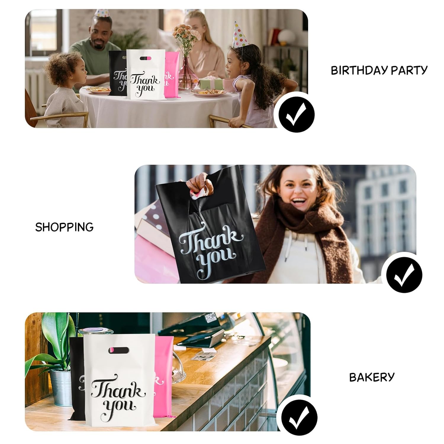 100 PLASTIC RETAIL BAGS : Premium Thank You gift bags great for holding various items as party bags, shopping bags,gift bags, retailer bags, merchandise bags , Double side printing Thank You bags.