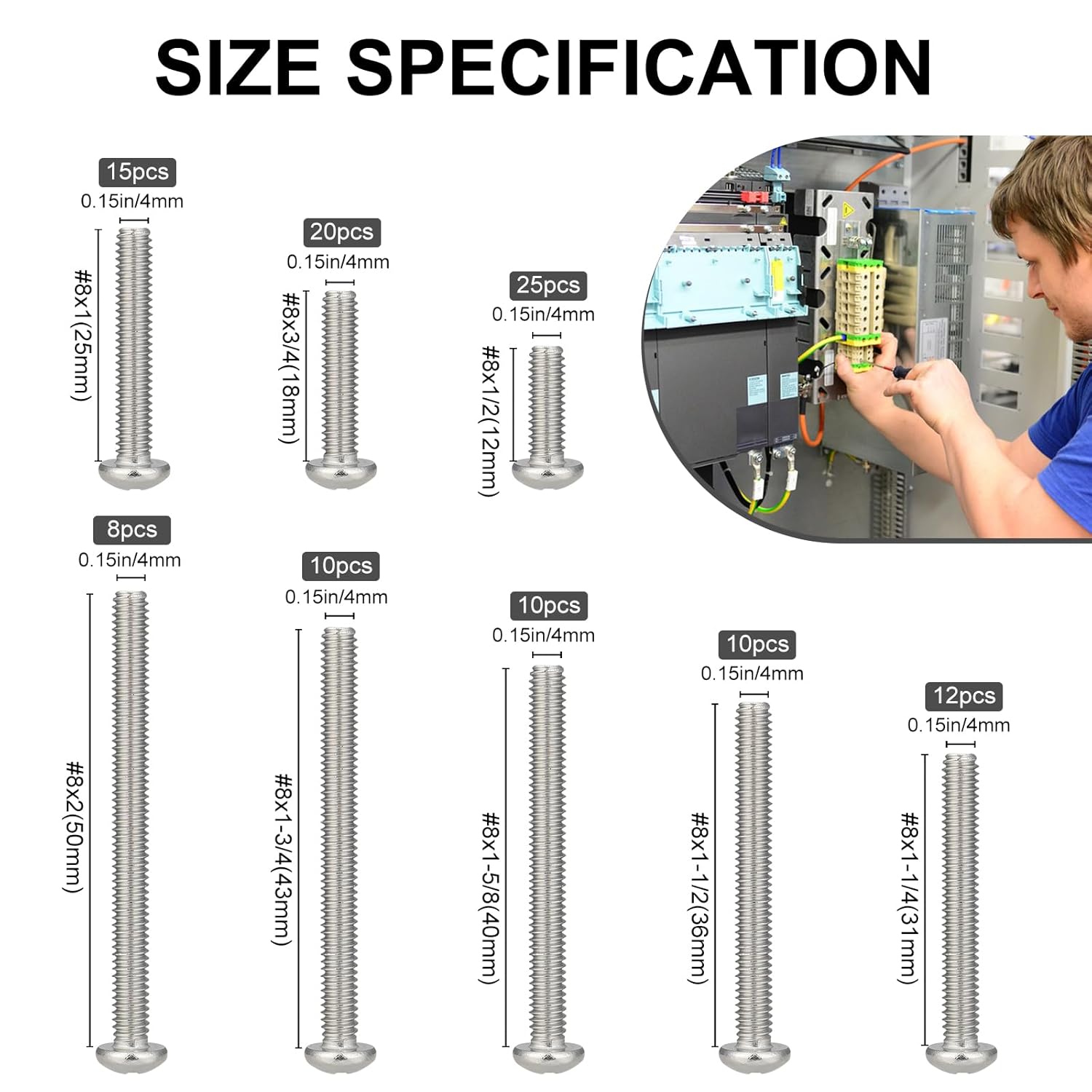 110Pcs Machine Screws Assortment kit,Assorted 1/2 to 2 inch Long # 8-32 Machine Screw,304 Stainless Steel Phillips Pan Head Screws Bolts for Electrical Wall Socket,Household Repairs