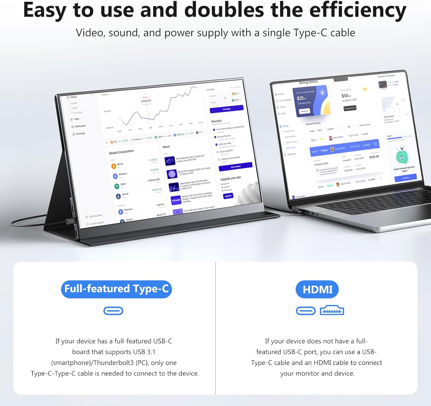 【Single-Cable Solution for Display and Power】A single USB Type-C cable handles both the video signal and power delivery, eliminating the need for a power outlet and enabling use anywhere. It also features a Mini HDMI port for screen extension and video output. No dedicated drivers are needed—it’s ready to use right out of the box. *Note: Your device must have a full-function Type-C 3.1 or Thunderbolt 3/4 port that supports DisplayPort Alt Mode. If power delivery is insufficient, please connect an external 5V/3A power source. A power adapter is not included.