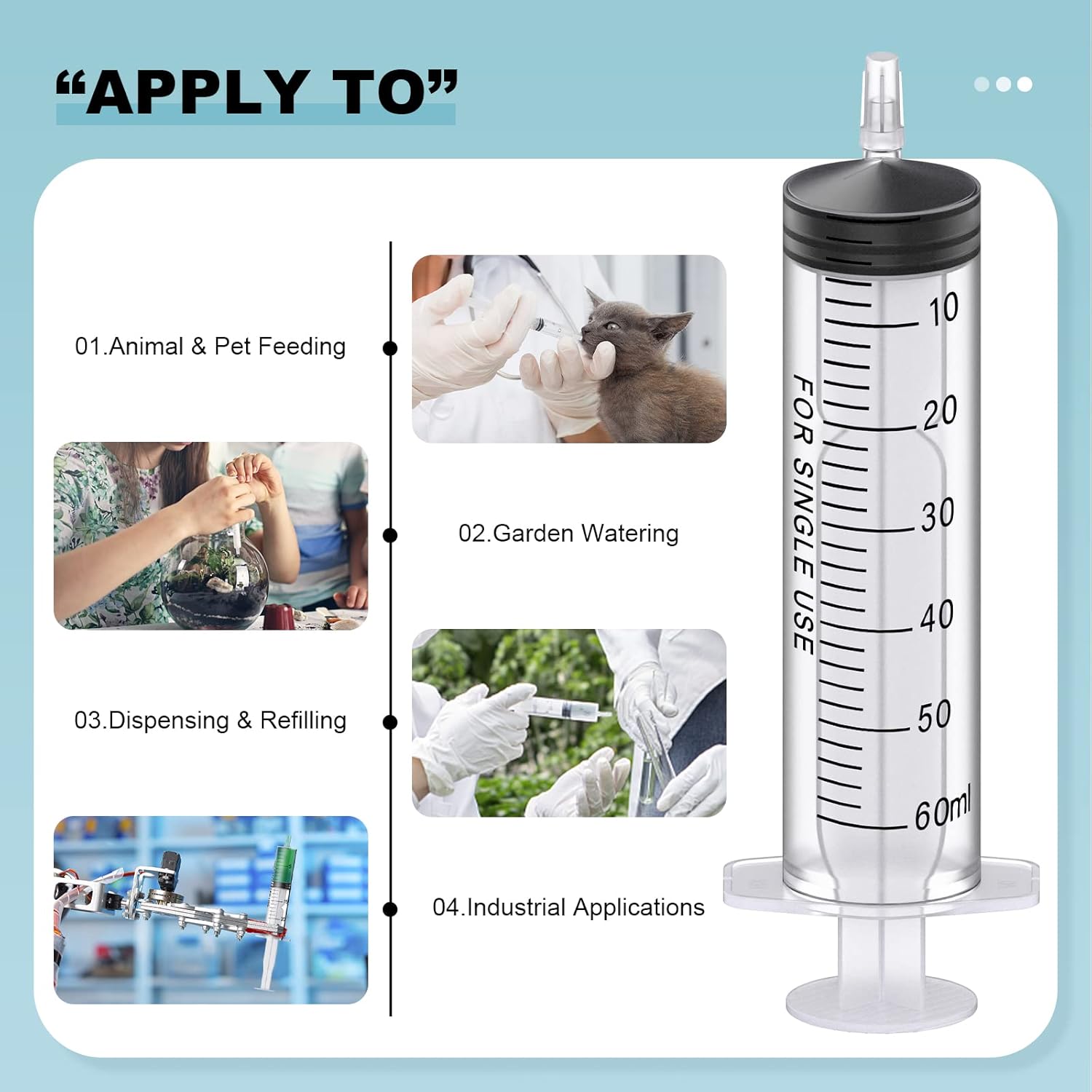 Omawrf provides high-quality syringes which are easy to use. They can be applied to Scientific Experiment, Industrial Production, Handicrafts, Pets Raising, Plants Cultivation, Cooking, etc.