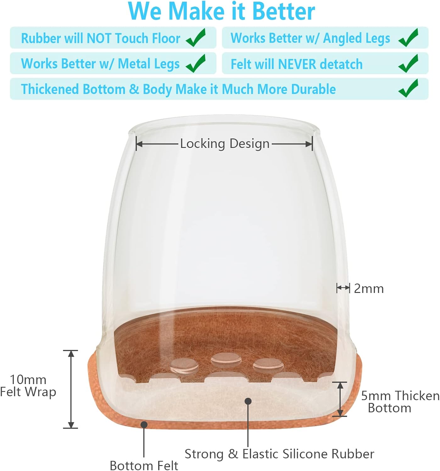 @【Upgrade New Design】: The Furniture Leg Floor Protectors is made of thickening silicone and 360°full felt pad bottom wrapped, which help the felt bottom be able to touch the floor at any angle, prevent the silicone touch and scrape the floor, and it will not easy to fell off any more compared to the old style protectors.