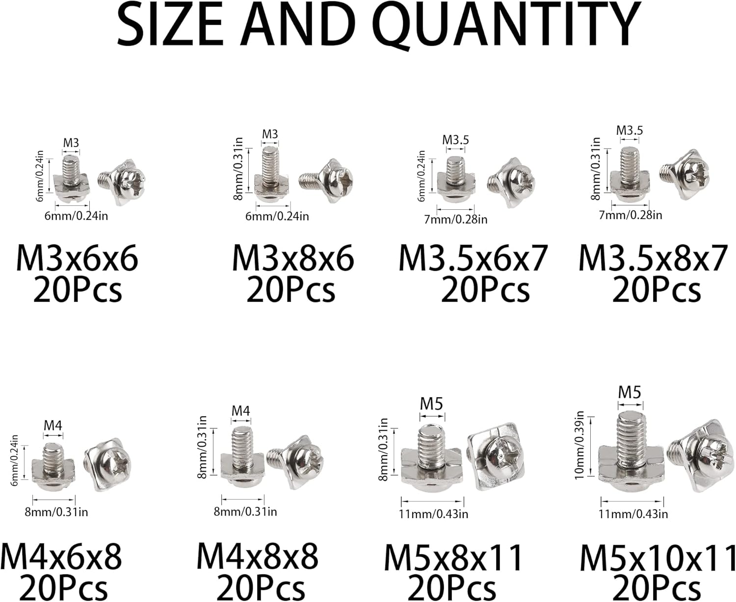 PACKING QUANTITY: 160Pcs screws 8 sizes (M3x6x6, M3x8x6, M3.5x6x7, M3.5x8x7, M4x6x8, M4x8x8, M5x8x11, M5x10x11)each size 20Pcs.