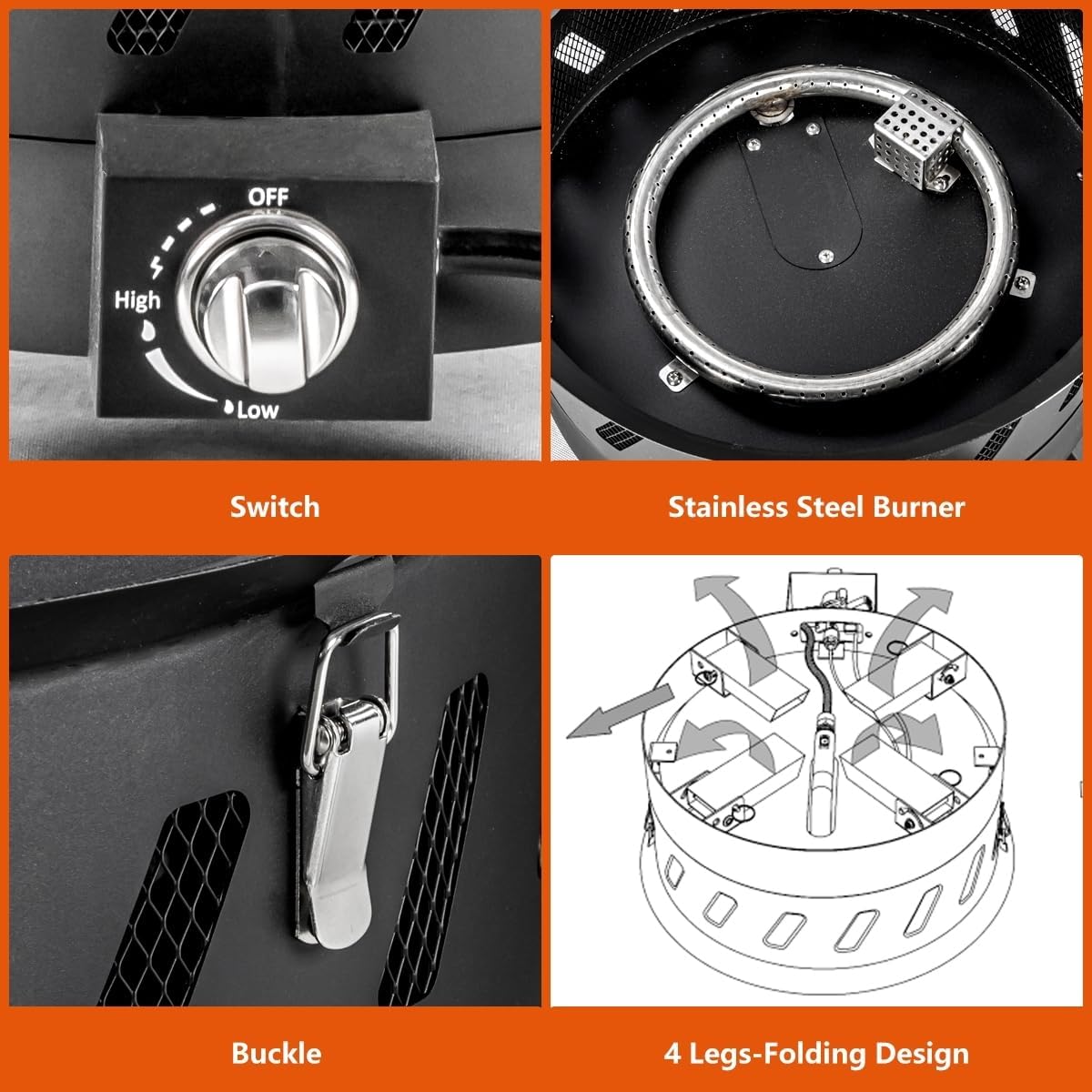 [Compact and Easy Carry]: Travel size gas fire pit is lightweight and portable; easily set up in minutes with no tools required. The lid of fire pit comes with a handle, so you can carry it away without a bag. The 4 legs of propane fire pit are foldable design, more efficient storage space.Equipped with a gas tank supoort which keep tank not tip over.
