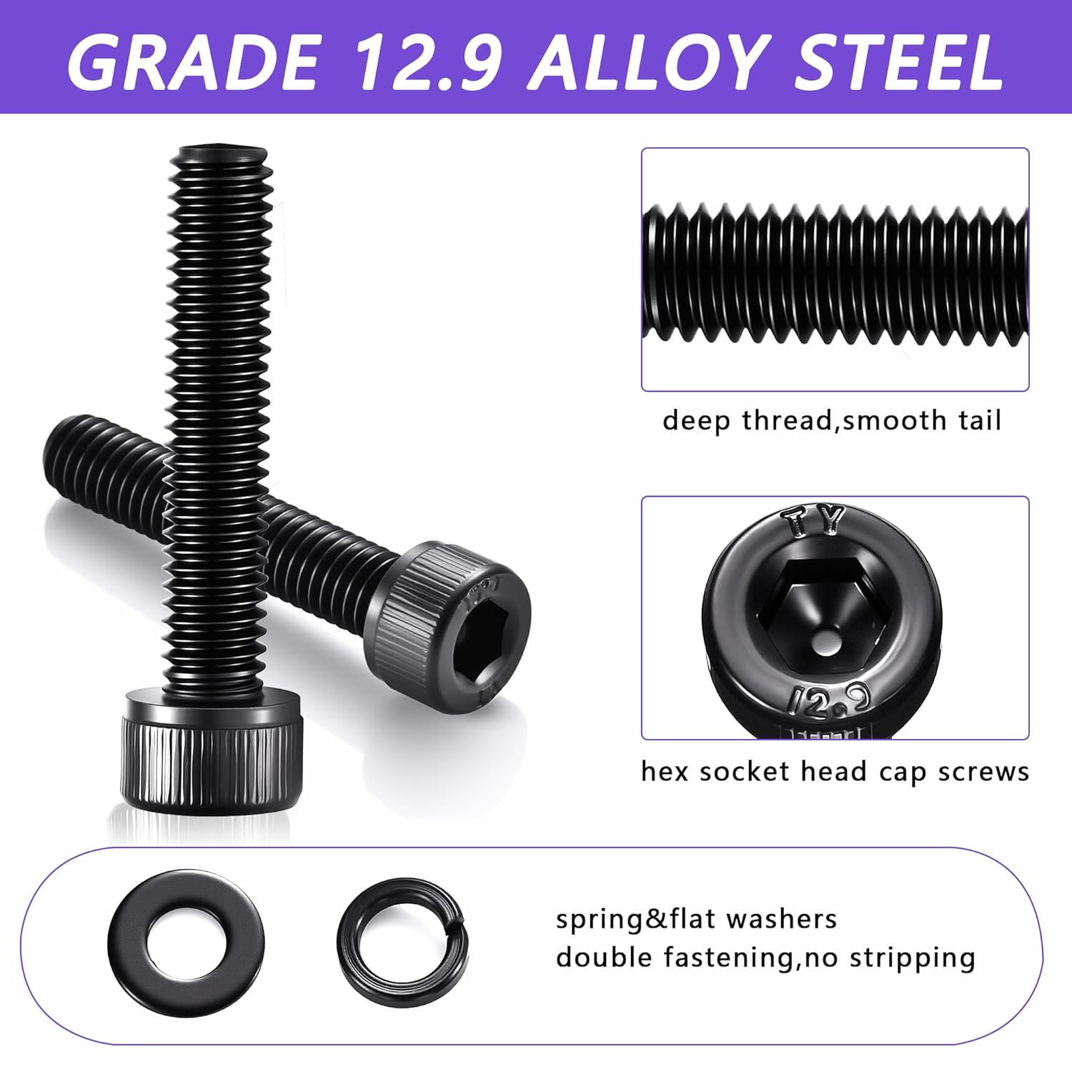 【12.9 ALLOY AND ZINC PLATED】The hardware is made of 12.9 grade alloy steel and zinc coated are designed for no corrosion with no oil face. Threads are clean and well cut. Nut fit snugly without excess movement. Washers are correctly sized for engagement