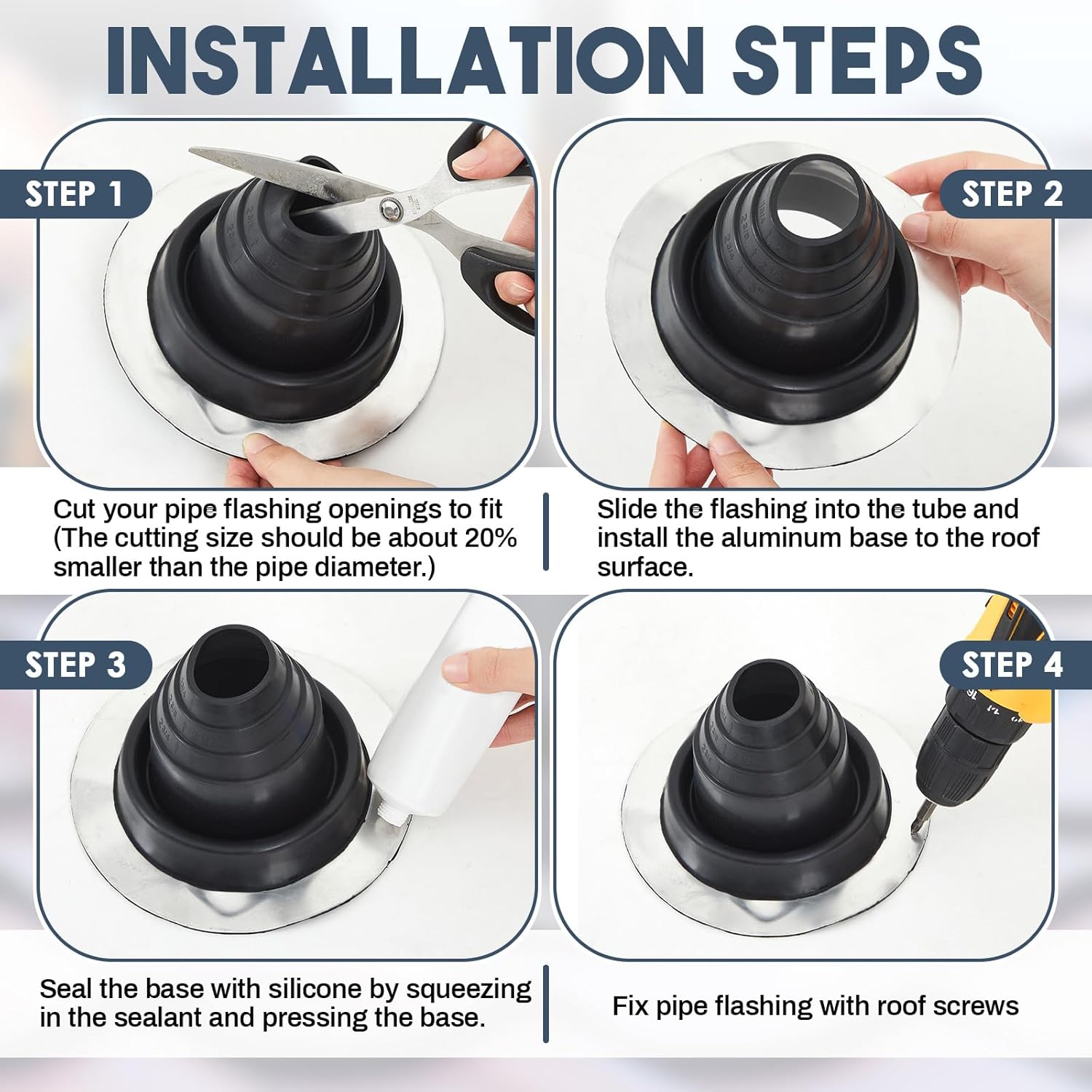 Easy to Use: designed for ease of use, the EPDM flashing can tilt up to 45 degrees, adapting to various roof installations; Whether your roof is sloped or flat, you can rely on this boot for a well sealed pipe mount installation, while saving your measuring time for making sure the detail size before setting, the cone shape allowing it move easily for various pipe size