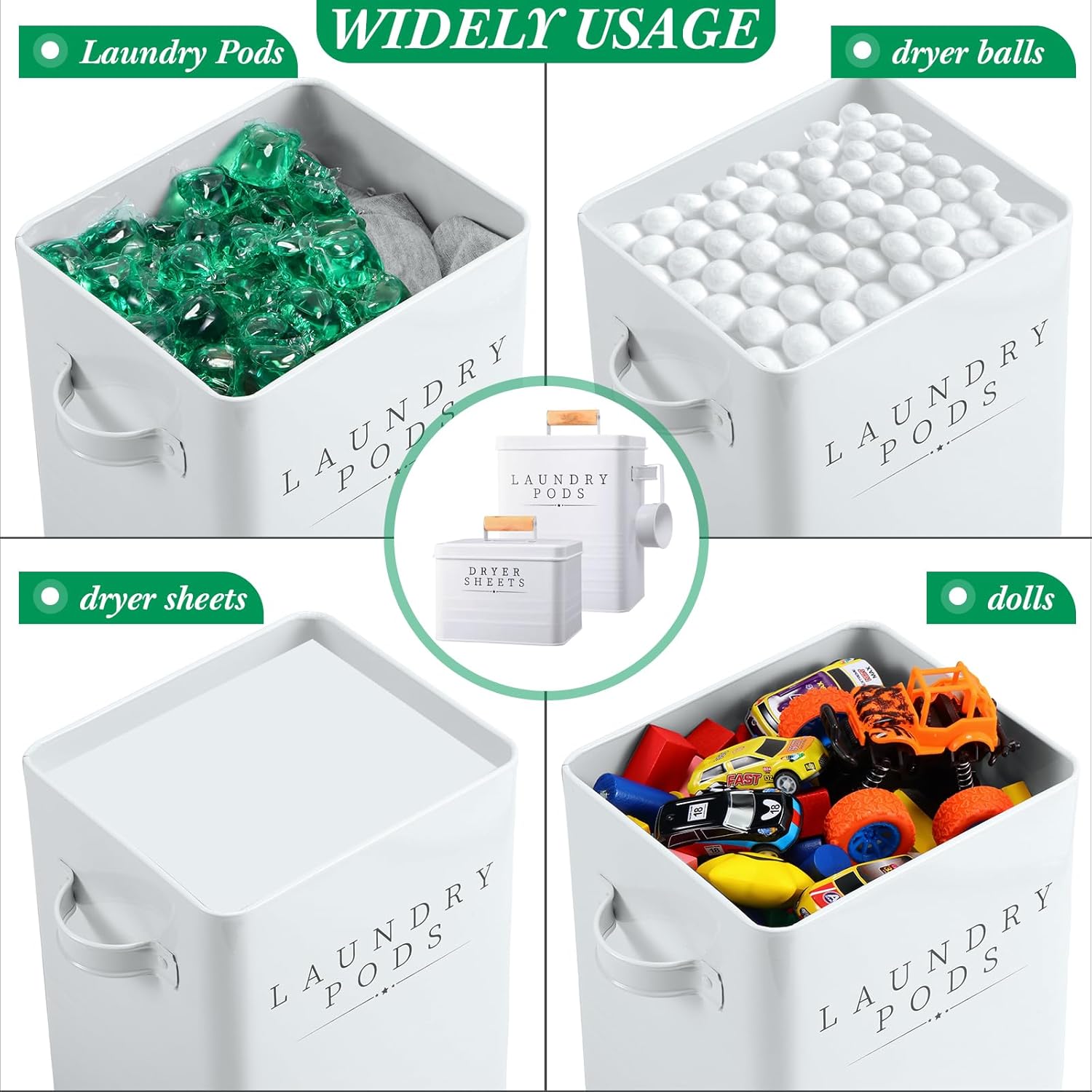 2 Pcs Laundry Pod Container with Dryer Sheet Holder Farmhouse Laundry Room Decor Organization and Storage Detergent Container Box with Lid Handle Metal Dryer Sheet Dispenser(White)