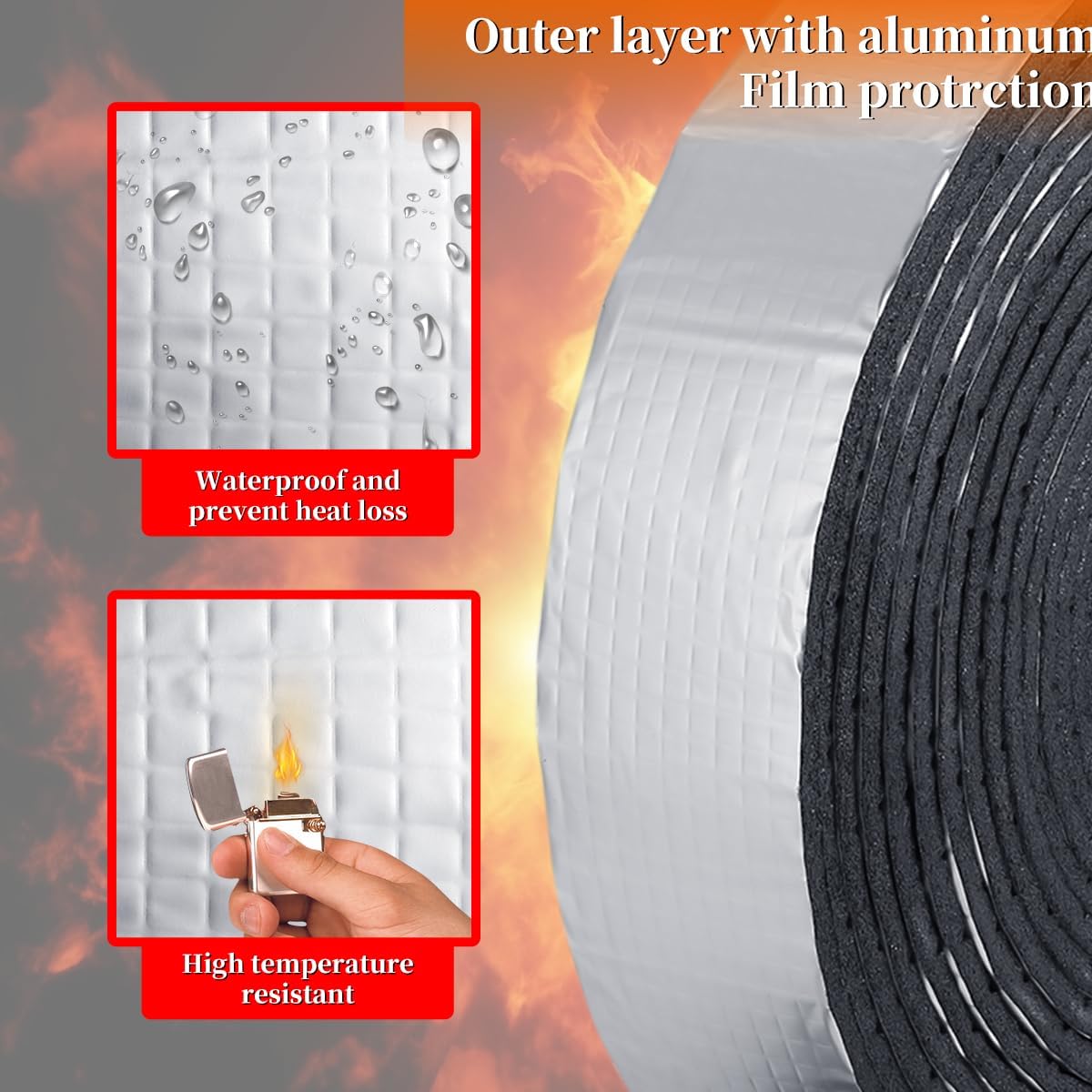 Outstanding Heat Preservation Performance: Our outdoor pipe insulation wrap roll boasts a 0.2-inch thick construction of rubber and plastic cotton, offering excellent heat preservation, waterproofing, fire resistance, and weather resistance properties. It effectively retains heat during winter, safeguarding outdoor pipes from freezing. In summer, the aluminum foil insulation layer shields water pipes from high temperatures and intense sunlight, preventing freezing and moisture buildup.