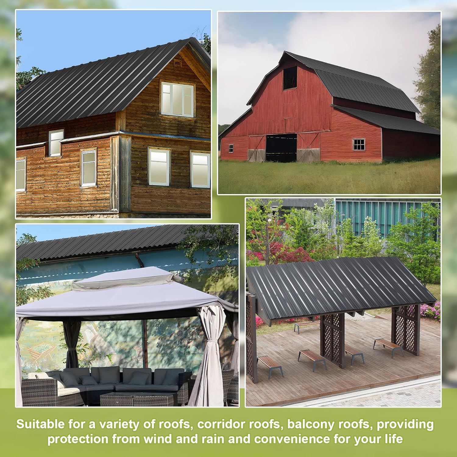 Versatile Use: these metal roof panels offer versatile application options; They can be applied for constructing roofs of sheds, garden fences, aisle roofs, garages, gazebos, patios, chicken coops, outdoor storage rooms and terraces; With their sleek black finish, these metal roofing panels can complement your structures while offering reliable protection