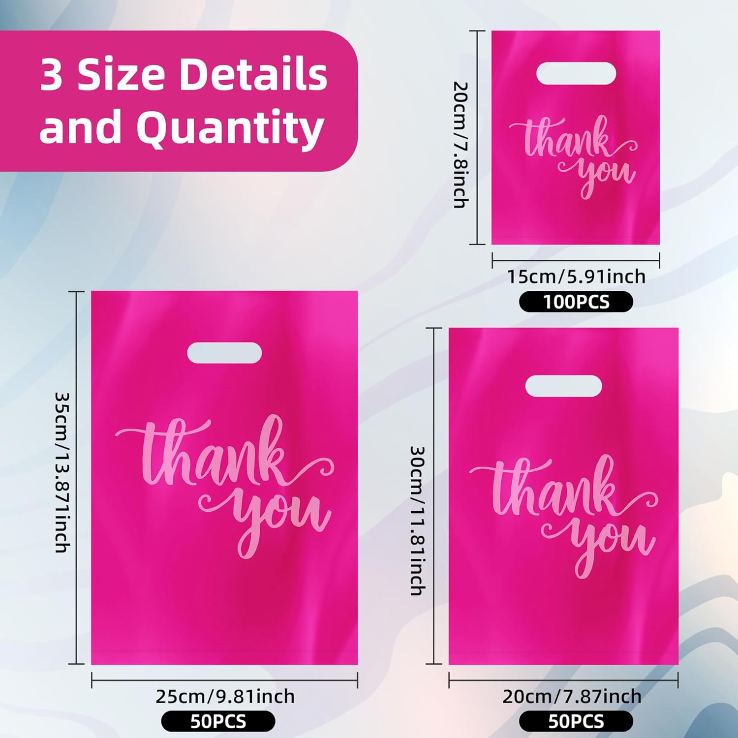 Inclued 3 size thank you plastic shopping bags can safely hold merchandise and medium sized products including clothing, books, gifts, samples, small gifts, artwork, toys and more.