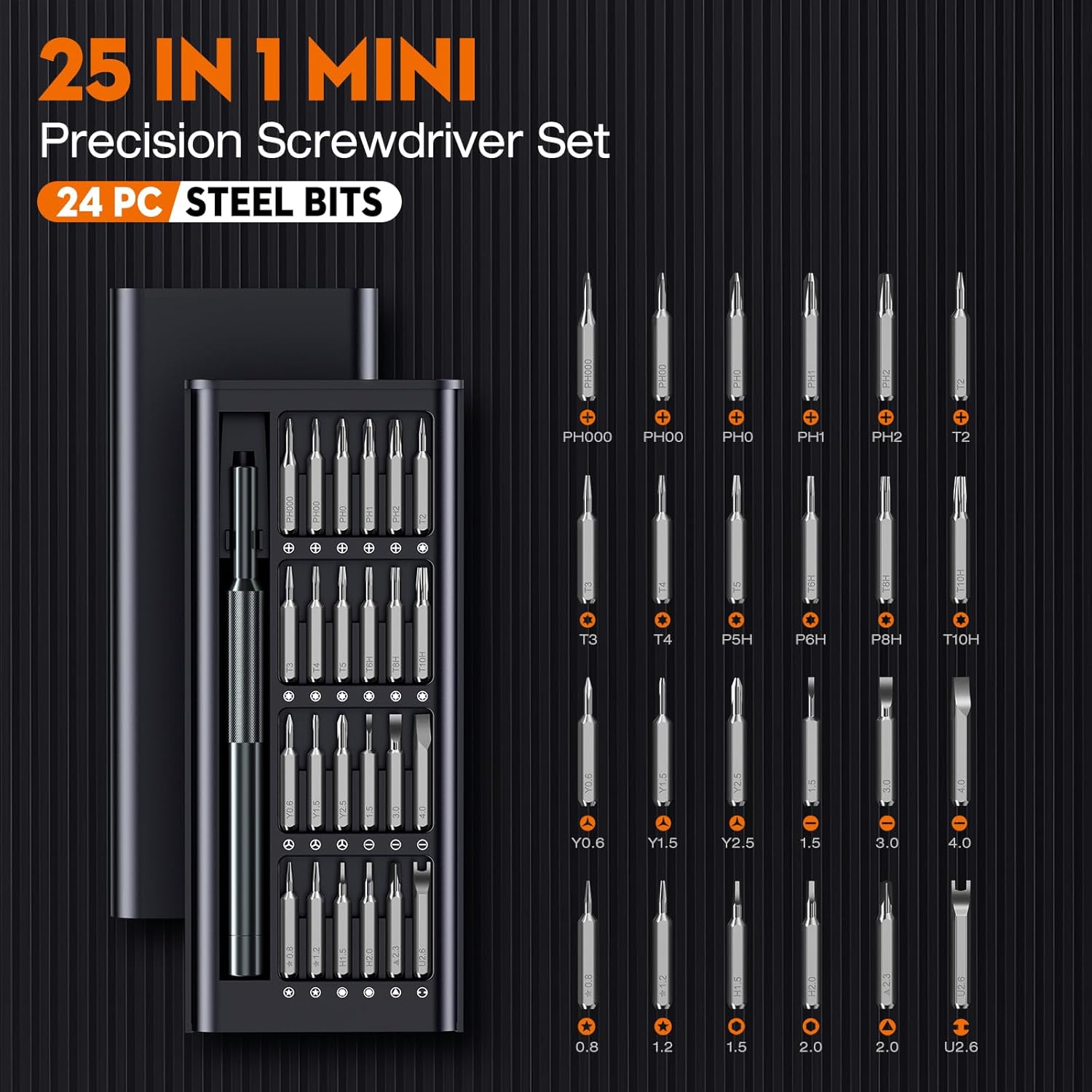 [25-in-1 Comprehensive Precision Screwdriver Set] The NSZETZ 25-in-1 mini screwdriver set comes with 24 different bits, including Phillips, Torx, Flathead, Pentalobe, and Hexagon, providing all the tools needed for a wide variety of repairs, from phones to electronics.