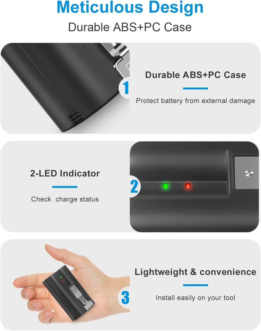 Super Capacity: Our 6040mAh rechargeable battery powers your tools for everyday use. With high-quality cells, it lasts longer than batteries of the same capacity.
