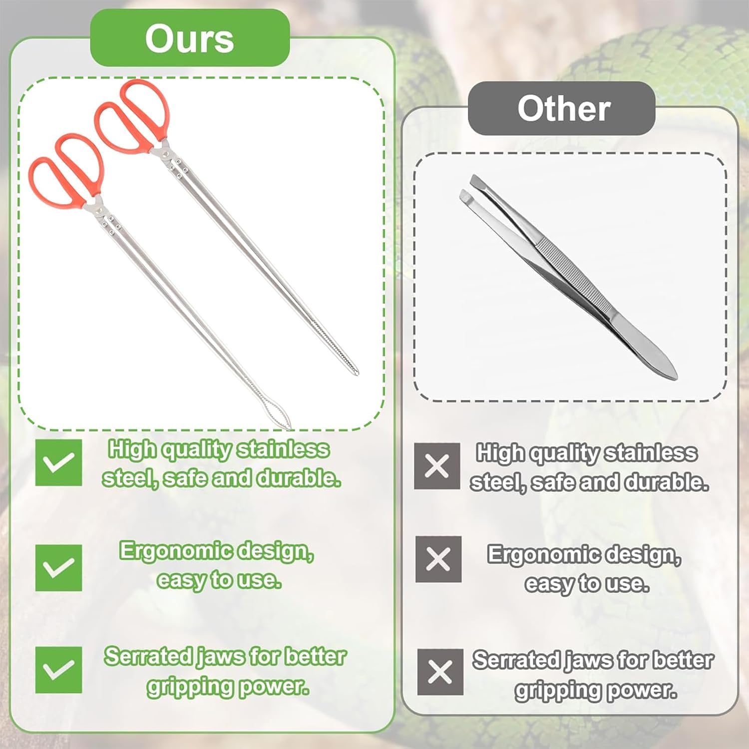 1.Safe and Reliable Length Design: Safety is crucial when feeding snake animals. With a total length of 20 inches, our snake feeding tongs are long enough to ensure that you have enough distance between you and the snake to reduce the risk of accidental bites. This design allows you to feel more secure and at ease during the feeding process.