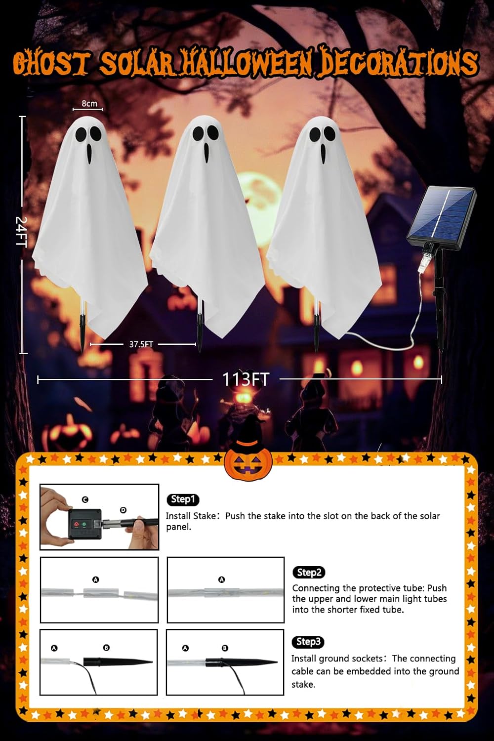 3-Pack Ghost Solar Powered Halloween Decorations Outdoor, Auto On/Off, Solar Halloween Lights for Garden Pathway Porch Yard Walkway Lawn Party Decor, 8 Modes & Waterproof Outdoor Halloween Decorations