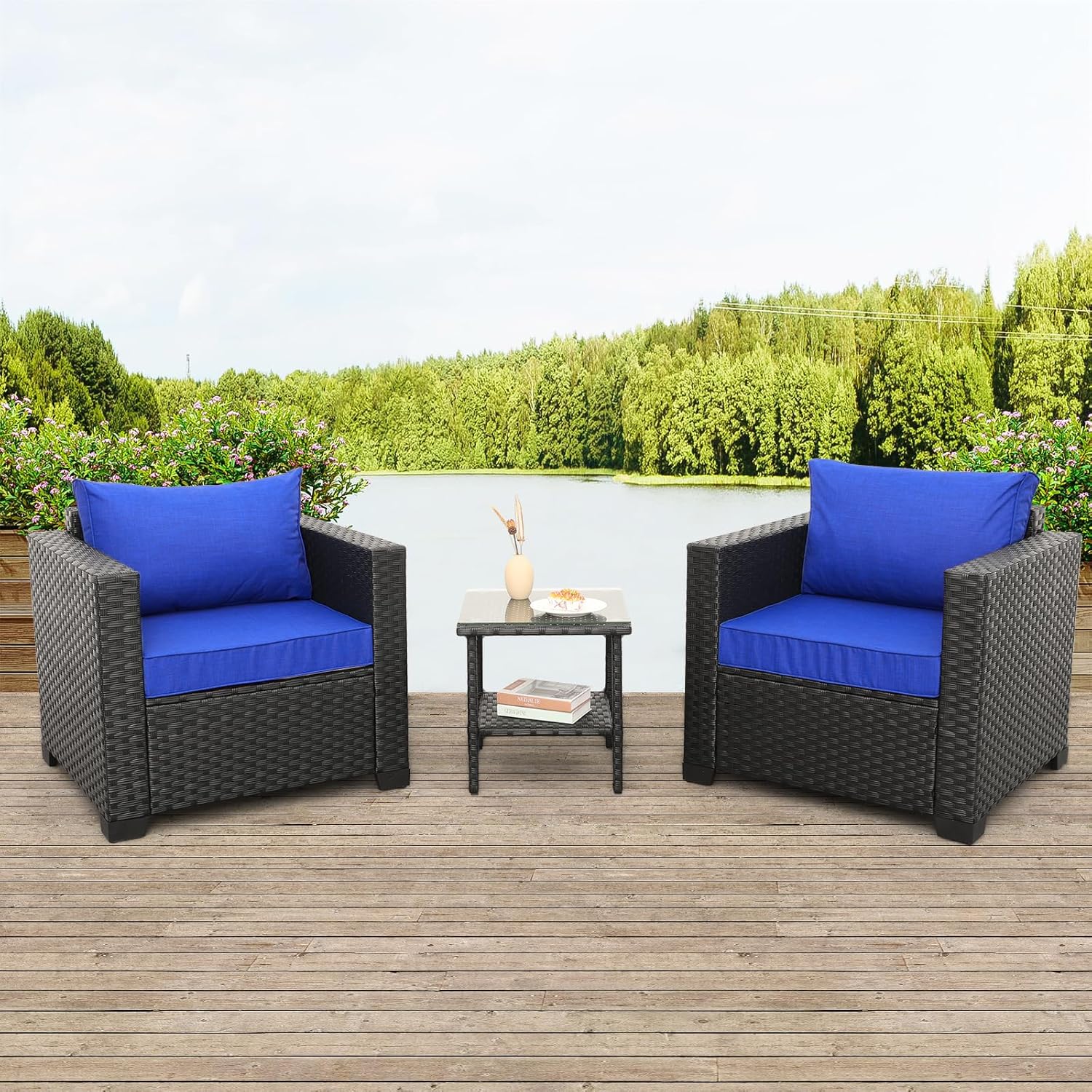 3 Piece Patio Set Wicker Patio Furniture Patio Conversation Sets Outdoor Chairs and Glass Side Table Balcony Furniture with Non-Slip Royal Blue Cushions and Waterproof Covers
