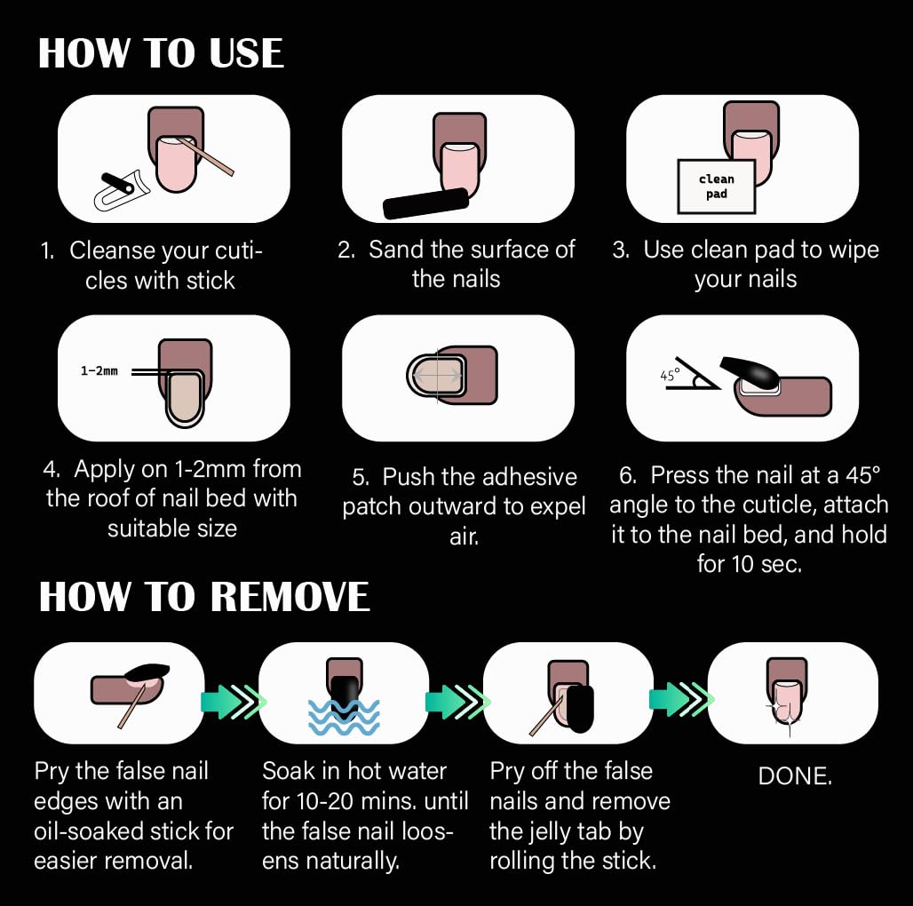 Preparation: Clean your hands and nails, ensuring the nail surface is dry and free of oil. Gently buff the nail surface with the included nail file to enhance adhesion.Select the Right Size: Choose the most suitable adhesive tab from the 15 available sizes based on your nail size.Apply the Adhesive Tab: Peel off the protective film from the adhesive tab and place it flat on your natural nail. Press gently from the center to the sides to ensure a snug fit.Attach the Press-On Nail: Align the press-on nail with the tab and press from the tip to the cuticle to secure it firmly.Finalize the Look: Press the press-on nail for 10-15 seconds to ensure full adhesion.