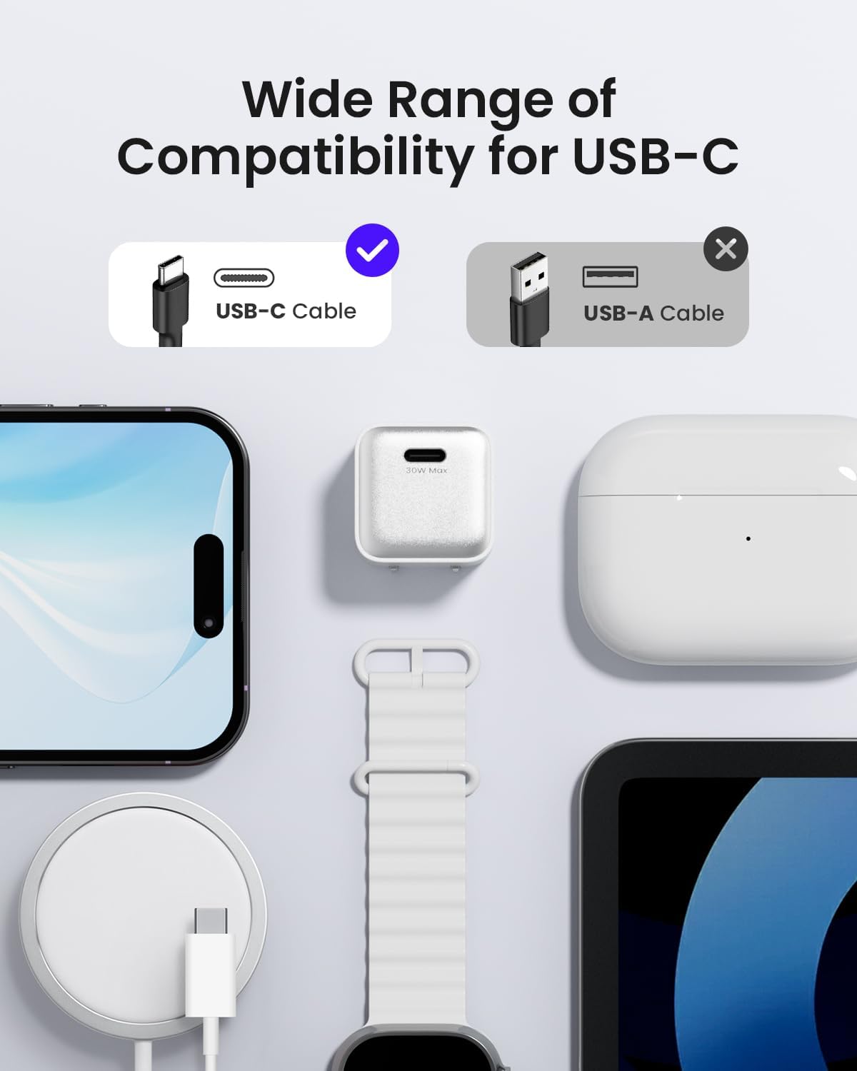 【Faster 30W Charger】 Provides full-speed 30W charging for iPhone 15/16 Pro and Pro Max, or charges iPad Air (5th generation) to 50% in just 40 minutes. Also Supports Samsung Galaxy Super Fast Charging (25W)