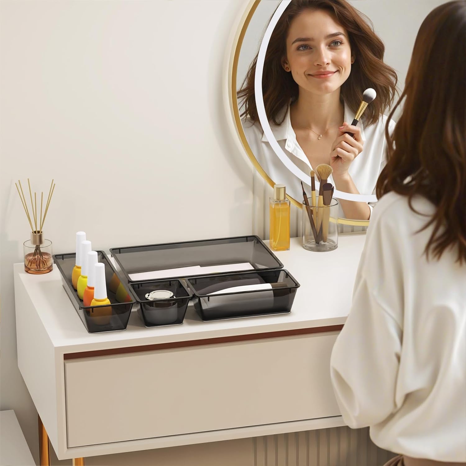 32 PCS Clear Plastic Drawer Organizer Set, 4-Size vanity organizer Trays and Storage Bins for Makeup, Jewelry and Gadgets in Bedroom, Bathroom and Office, Clear Black