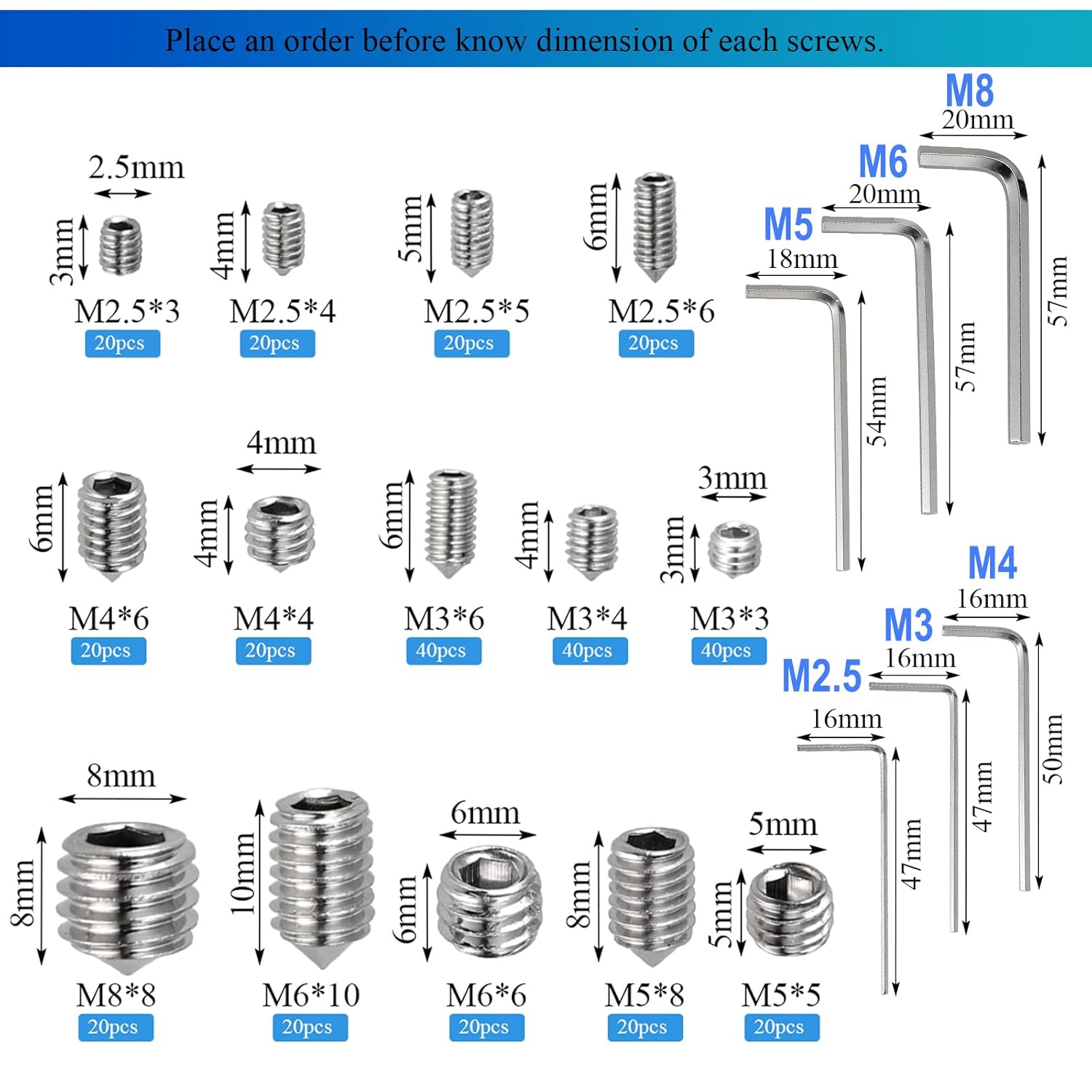 M2.5*3mm–20pcs; M2.5*4mm–20pcsM2.5*5mm–20pcs; M2.5*6mm–20pcsM3*3mm–40pcs; M3*4mm–40pcsM3*6mm–40pcsM4*4mm–20pcs; M4*6mm–20pcsM5*5mm–20pcs; M5*8mm–20pcsM6*6mm–20pcs; M6*10mm–20pcsM8*8mm–20pcs6pcs free hex wrenches