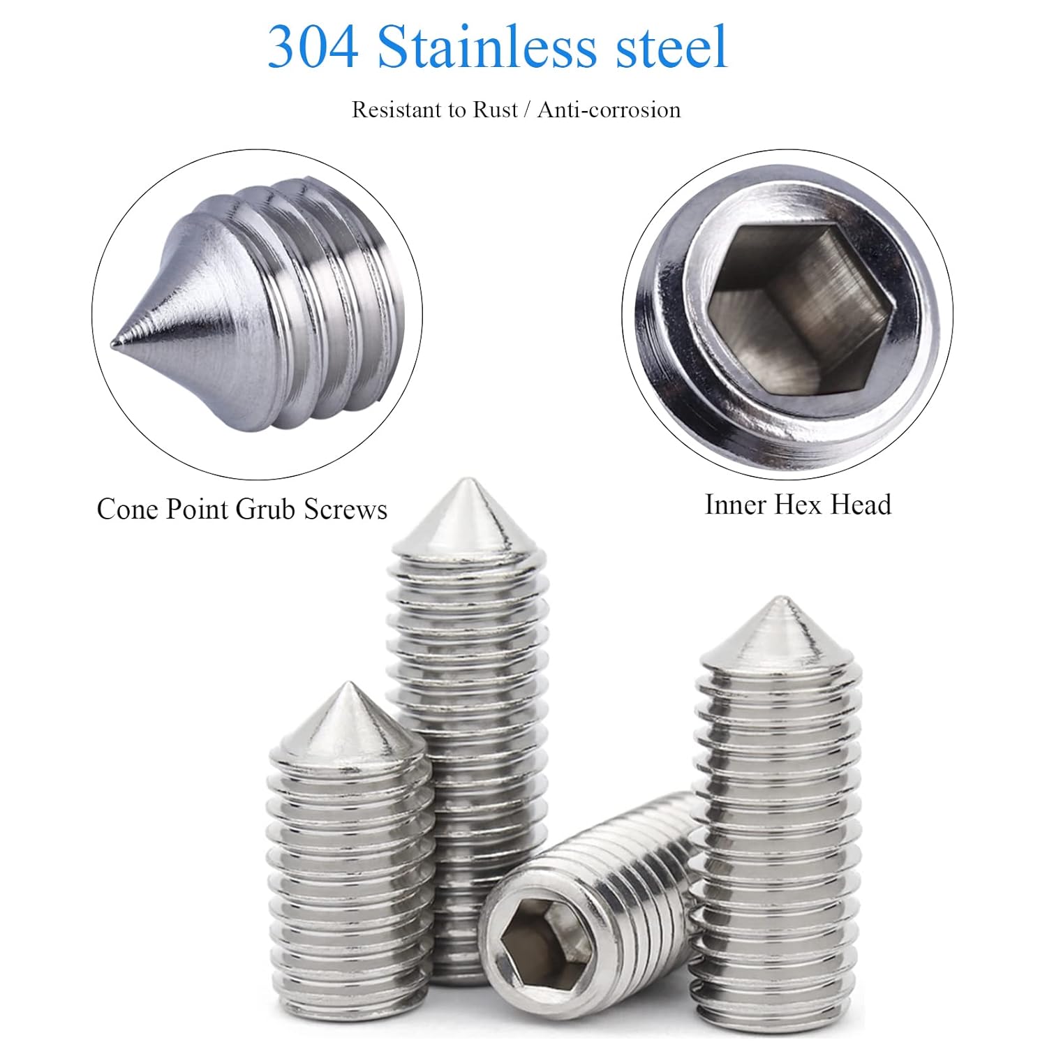 304 stainless steel ensures our hexagon socket head screws sturdy and durable, corrosion and rust resistant.6pcs free relevant hex wrenchs are included, for easy handle.340pcs of cone point grub screws are organized in a separated girds storage box.