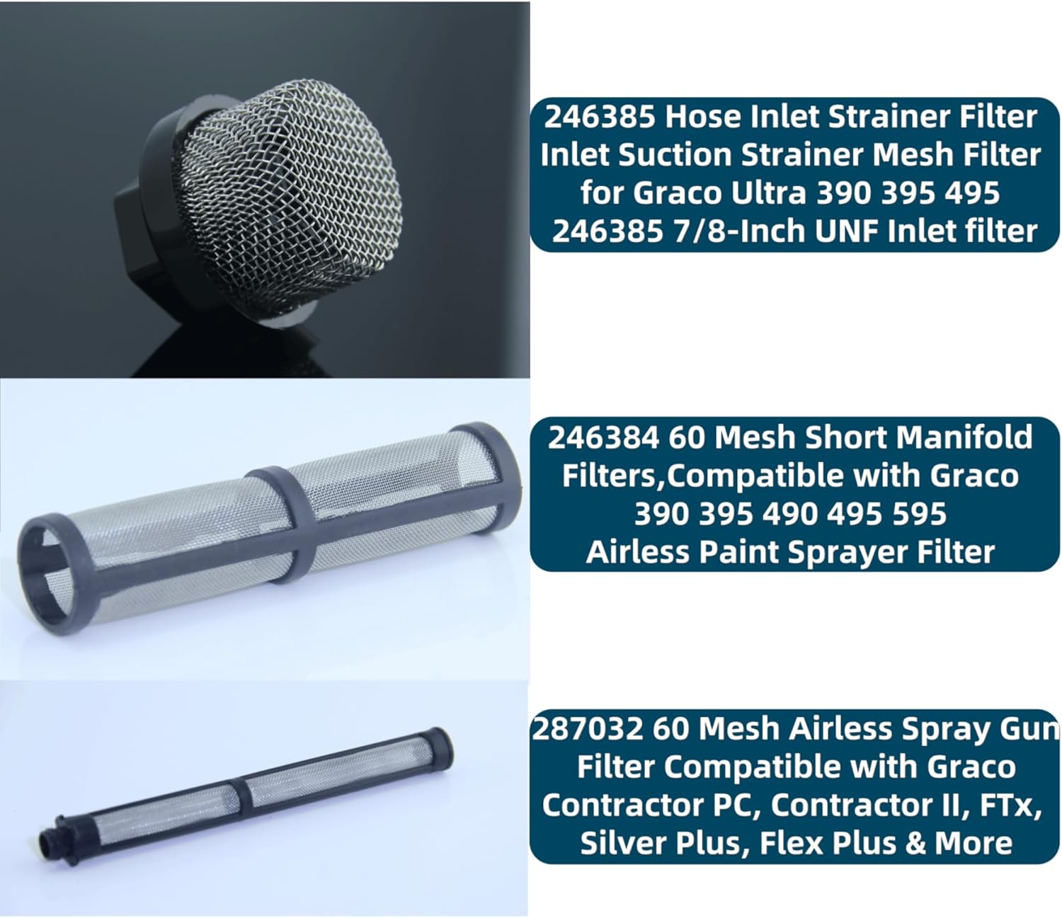 246385 287032 246384 3+4+5 PCS 246385 287032 246384 Airless Spray Filter Screen Set(3+4+5pk) Suction Pipe Filter Screen Spray Pump Inner Core for Graco 390 395 490 495 495 595 3400 Sprayers 235014 235014 Airless Prime Spray Valve Drain Valve Replacement for Graco 390 395 490 495 595 Aftermarketr Airless Paint Sprayer 244194 244194 Pump Repair Packing Valves Kit, for Graco 210 230 295 390 395 490 495 595 Airless Paint Spray Aftermarket 246384 246384 Airless Paint Sprayer Filter 390 395 490 495 595 Pump Manifold Strainer 60 mesh 5 Pieces Compatible with Graco 246384 for Airless Paint Sprayers 246385 246385 Hose Inlet Strainer Filter Inlet Suction Strainer Mesh Filter for Graco Ultra 390 395 495 Airless Wagner Spraytech Titan Paint Pumps, Paint Spray Guns 287032 Airless Spray Gun Filter 287032 Stainless Steel Compatible with Graco Spray Gun Contractor II and FTx II Latex 60 mesh