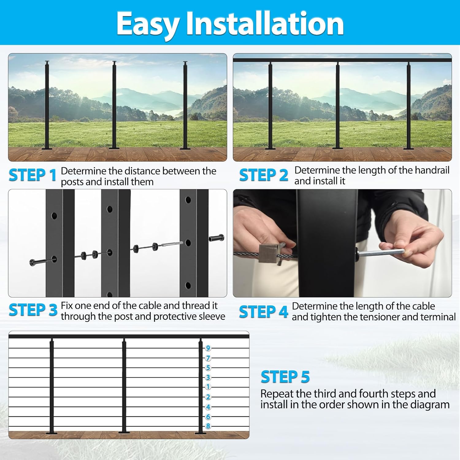 Easy to Install: The black cable railing post kit is built for convenience and simple installation. The package includes a use guide, the accessories and tools needed for installation, which can be seen clearly in the second picture. The bottom of the posts can be installed on concrete or wooden floors and the top can be matched with metal or wood handrails. In order to meet different installation requirement, all screws needed are included. DIY your cable railing system at will