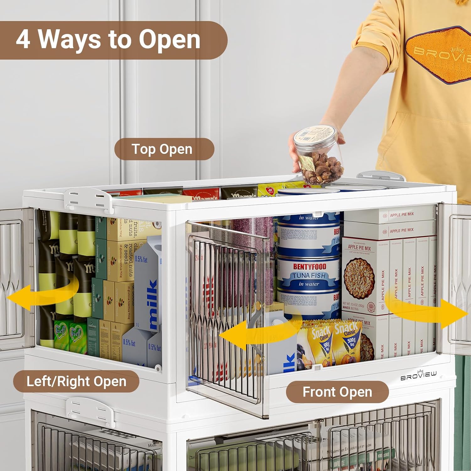 【Four Ways Opening and Magnetic Closure】The plastic storage bins with lids feature 4x opening methods – front double doors, right door, left door, or top lid opening. The front and side door with magnetic design are convenient for daily access, while the lids with latch is convenient for taking larger items such as quilts and blankets.
