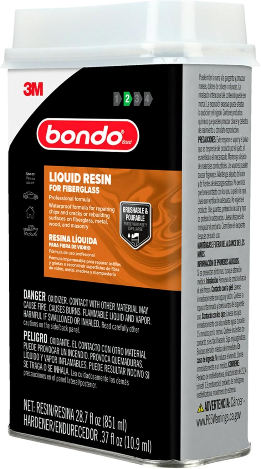 3M Bondo Fiberglass Resin 28.7 US Fl oz Filler with 0.37 Fl oz Hardener, Stage 2, Waterproof Formula for Repairing, Resurfacing, or Rebuilding Metal, Wood, Fiberglass or Masonry Surfaces (00402)