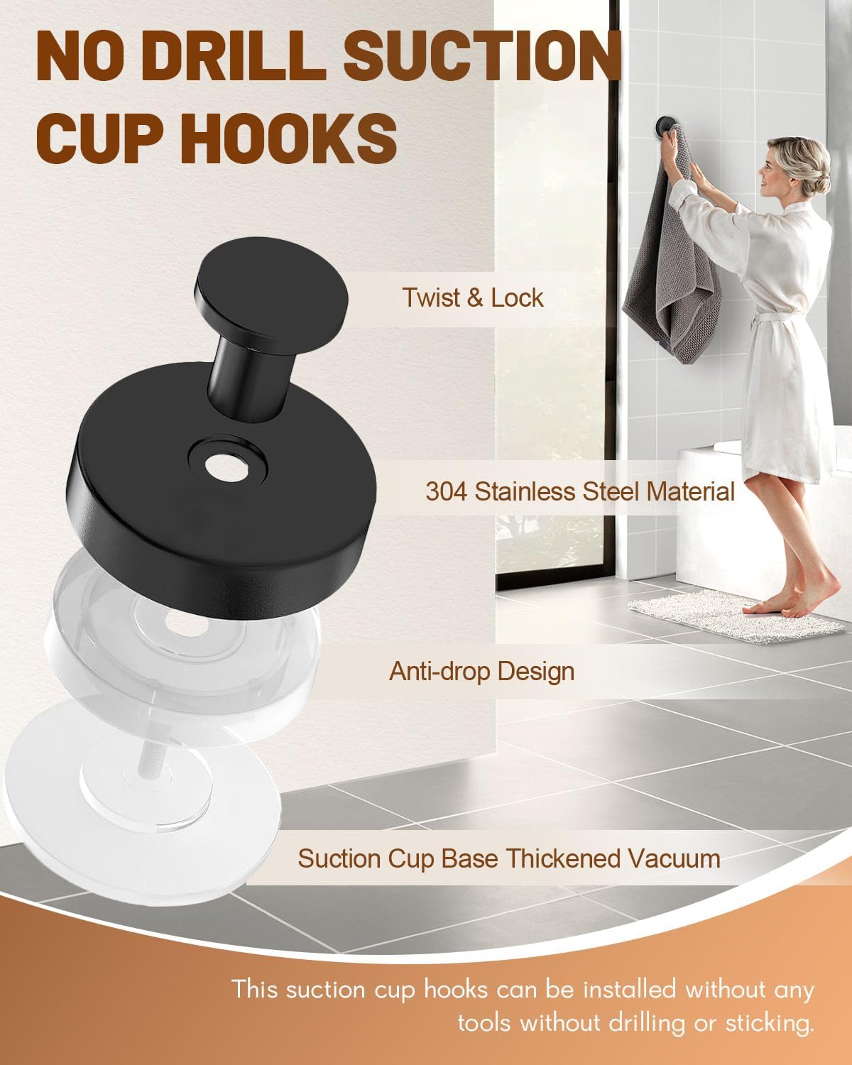 【2025 Upgraded No-Drill Suction Cup Hooks】: This suction cup hooks can be installed without any tools without drilling or sticking. So it’s no damage for your wall, just turn the suction cups by hand to complete the installation of the suction cup hooks. Effortlessly attach these hooks to smooth surfaces like tiles, glass, mirrors, marble, acrylic, metal, smooth wood, and laminate.