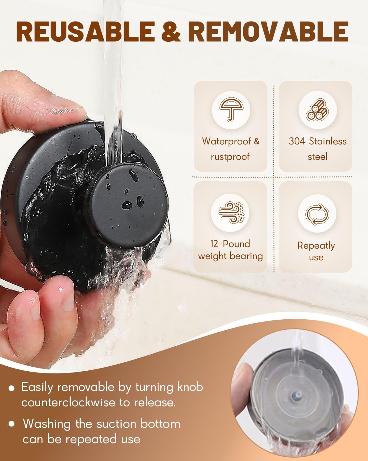 【Reusable & Removable】: Suction cup hooks for shower is made of durable 304 stainless steel material with waterproof and rustproof. Effortlessly removable by turning knob counterclockwise to release and using knife pry out. Washing the suction bottom can repeatly use. The hangers are removable and repositionable, and won’t leave any marks or sticky residue.