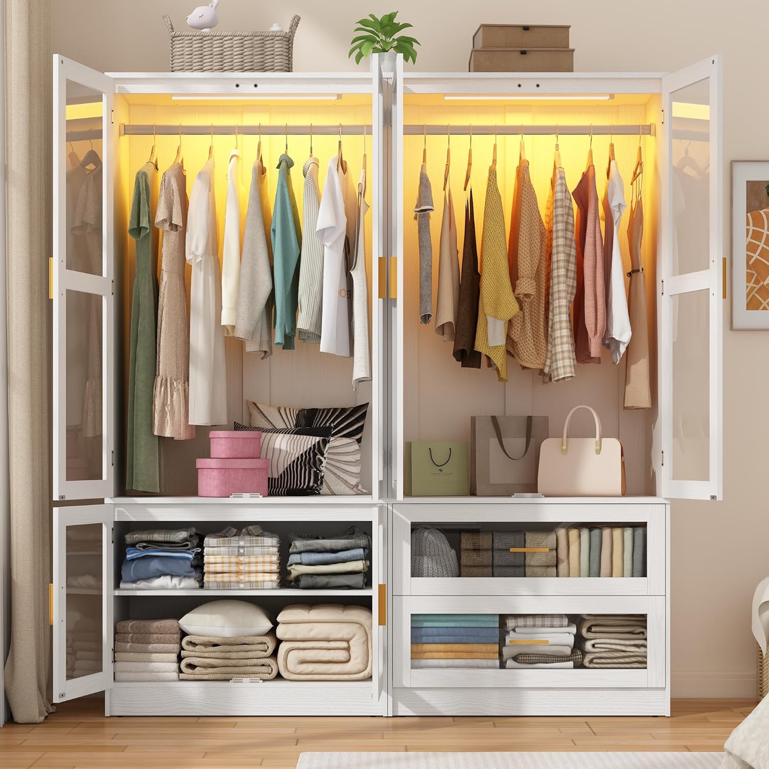 Visual High-Definition Tempered Glass Door Board Structure:Adopting high-transmittance tempered glass door board structure, transparent design, clear vision, convenient to check and find the clothes and items stored inside,It saves you the hassle of searching for clothes in your closet. Plus the built-in LED light effect, let your wardrobe’s internal storage system become part of the space display art.