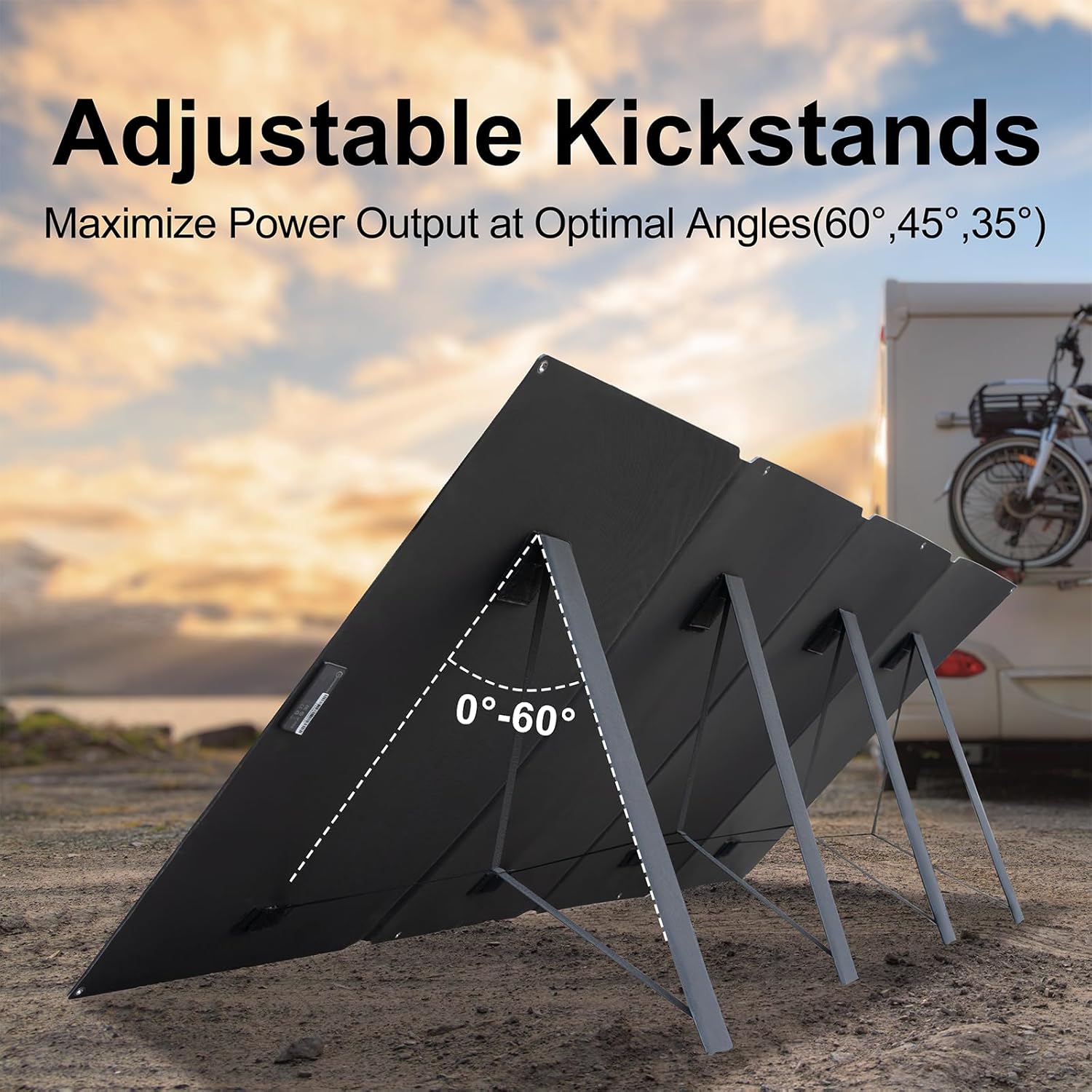 【Foldable & Portable Solar Panel】Designed for portability and convenience, the 410W solar panel features a lightweight, multifold design with a zippered accessory pouch. Once unfolded, 4 incorporated kickstands allow for easy positioning on any flat surface to give you instant charge from sunlight