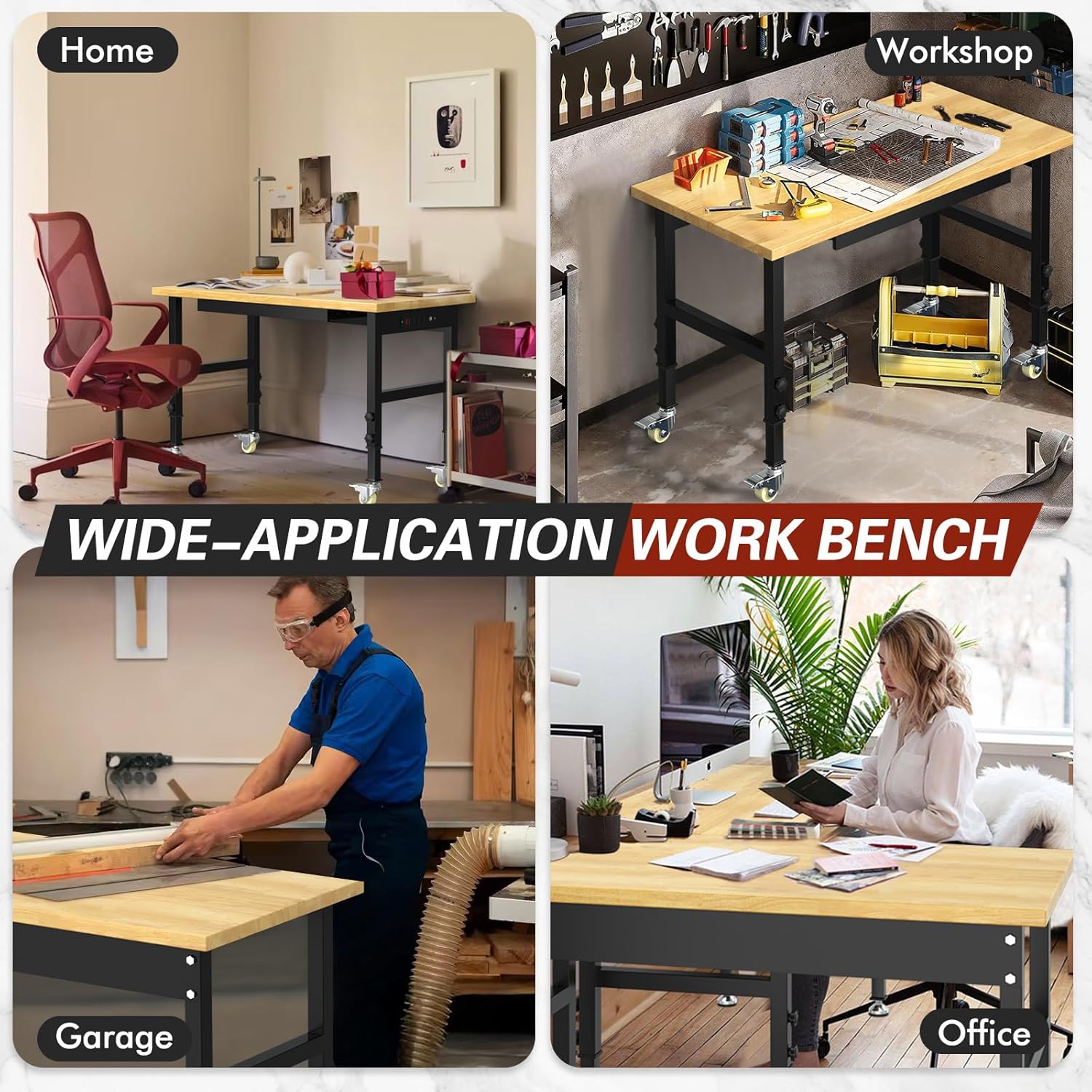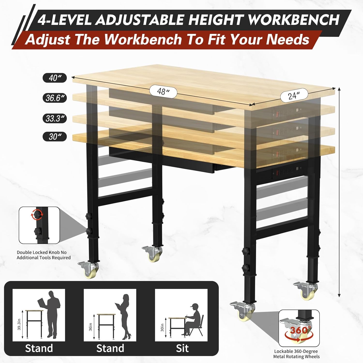 48 “Adjustable Workbench with Drawers, Heavy Duty Work Bench with Wheels & Power Outlets, 2000 LBS Load Capacity Wooden Workbench top for Garage, Workshop, Office, Home