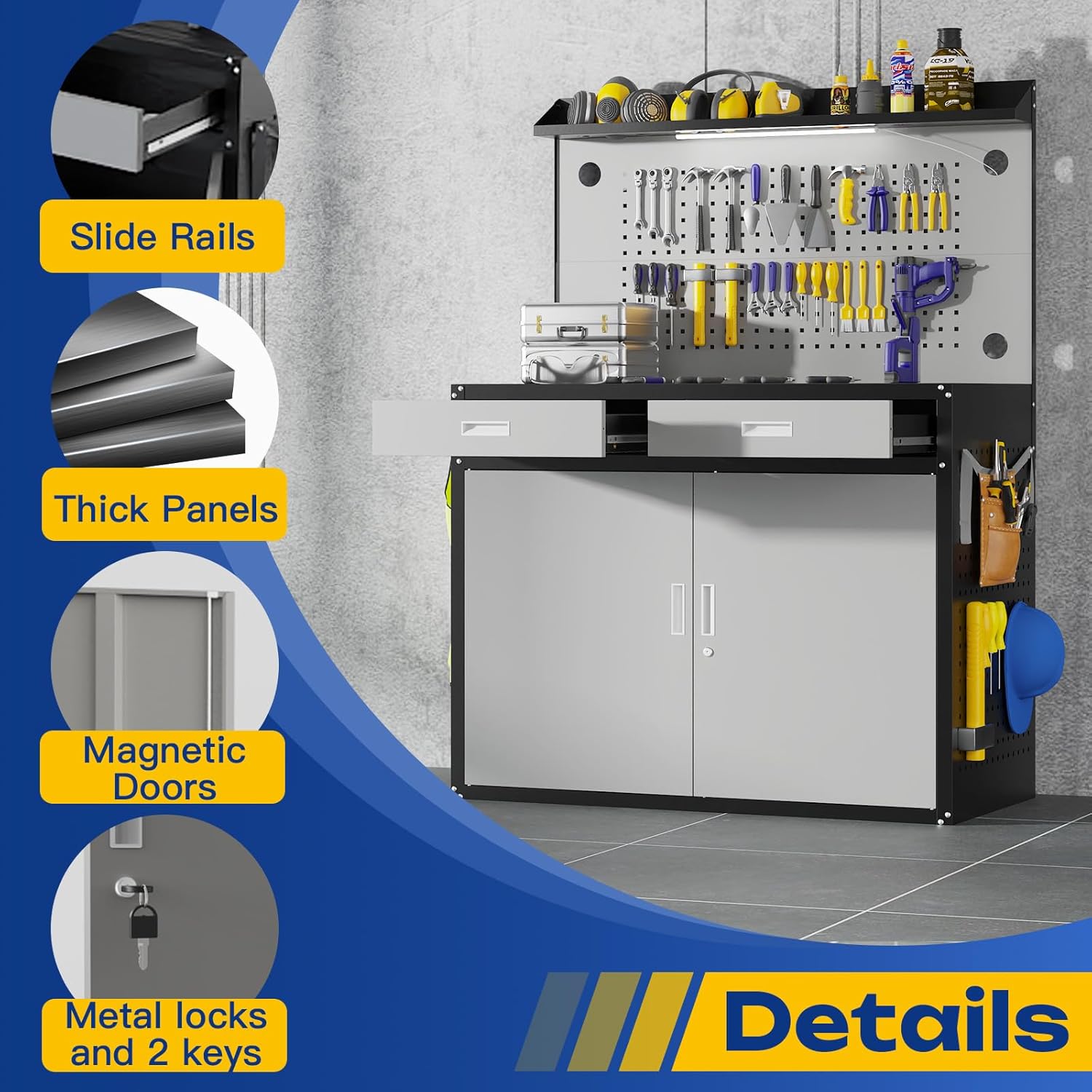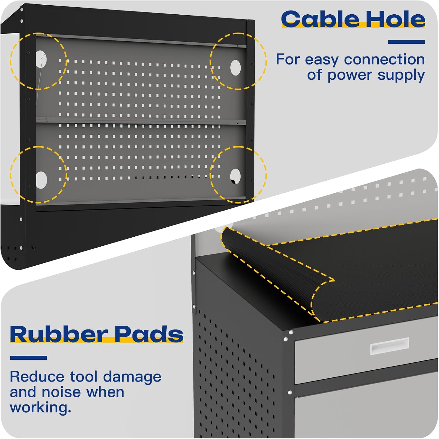 【Practical Design】Work table for garage is designed with 4 round holes on the back of the pegboard, which is convenient for you to connect the power supply. The workbench table is also equipped with rubber mats, which can reduce the damage of tools and also slow down the noise. The workbench’s storage cabinets are also designed with magnetic doors and are equipped with keys and locks for added security. The drawers are also designed with slides for your convenience. Our workbenches ensure a comfortable working environment.