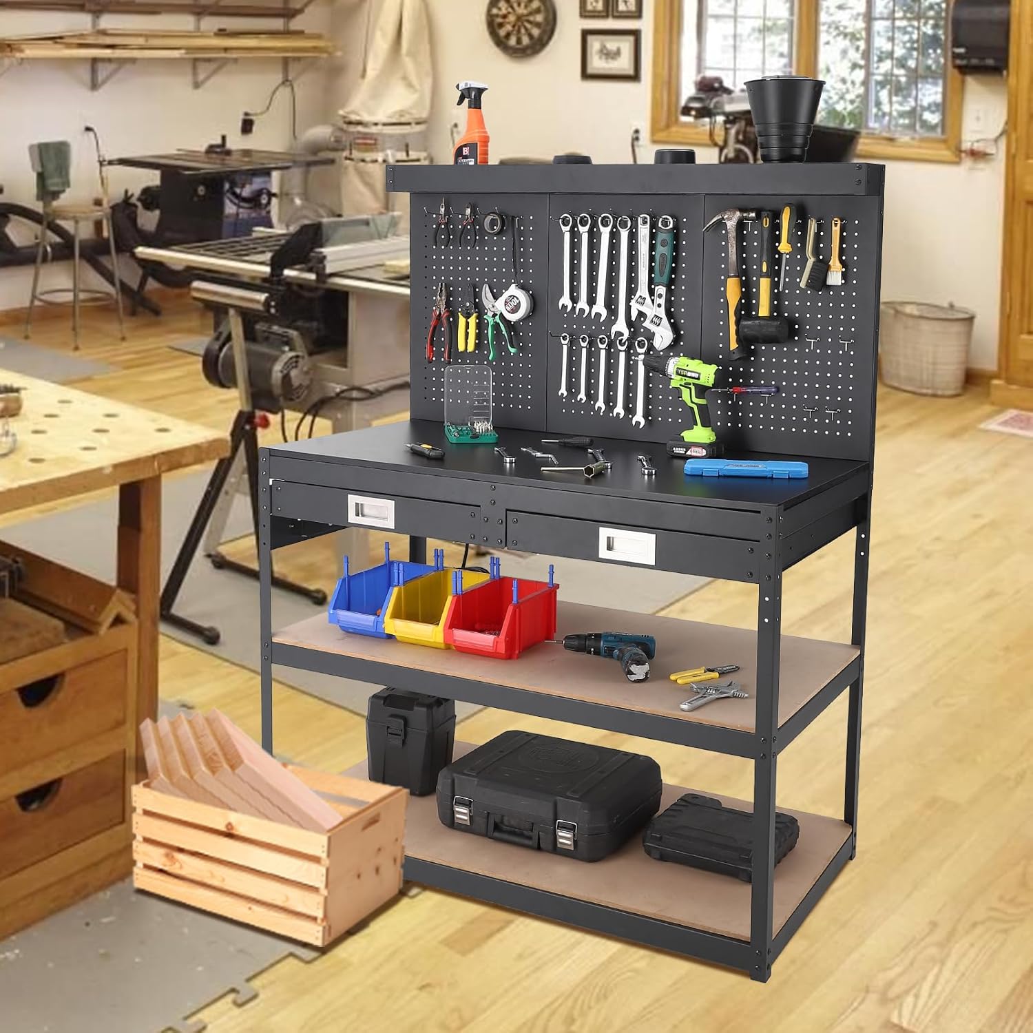 Versatile and Functional Design: The metal frame construction ensures stability and longevity, while the pegboard and storage options enhance usability for a wide range of workshop repairs and tasks.
