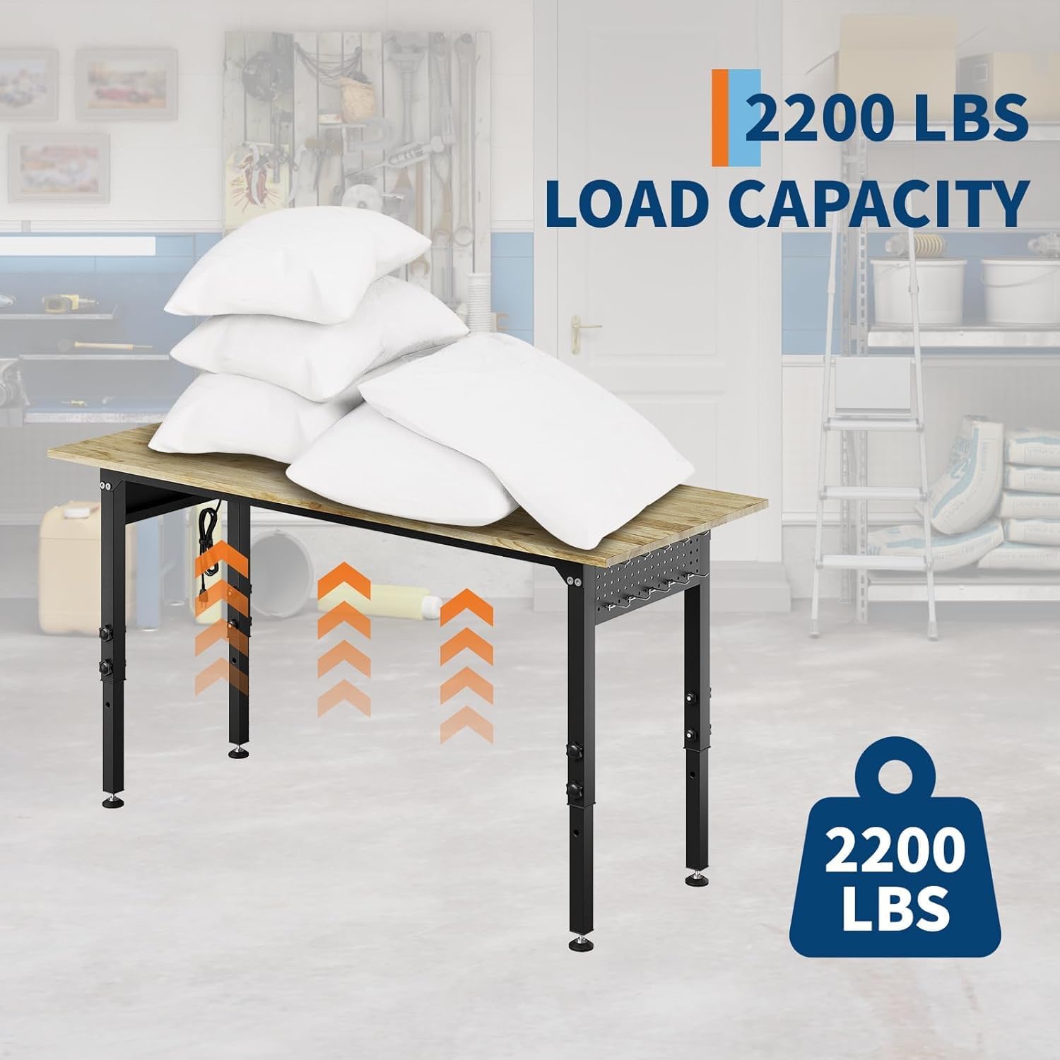 Adjustable Height 5-level : This adjustable garage workbench features a height range of 27.9 to 37.4 inches, accommodating various tasks. Customize your workspace for DIY projects, repairs, or crafts to maximize comfort and efficiency