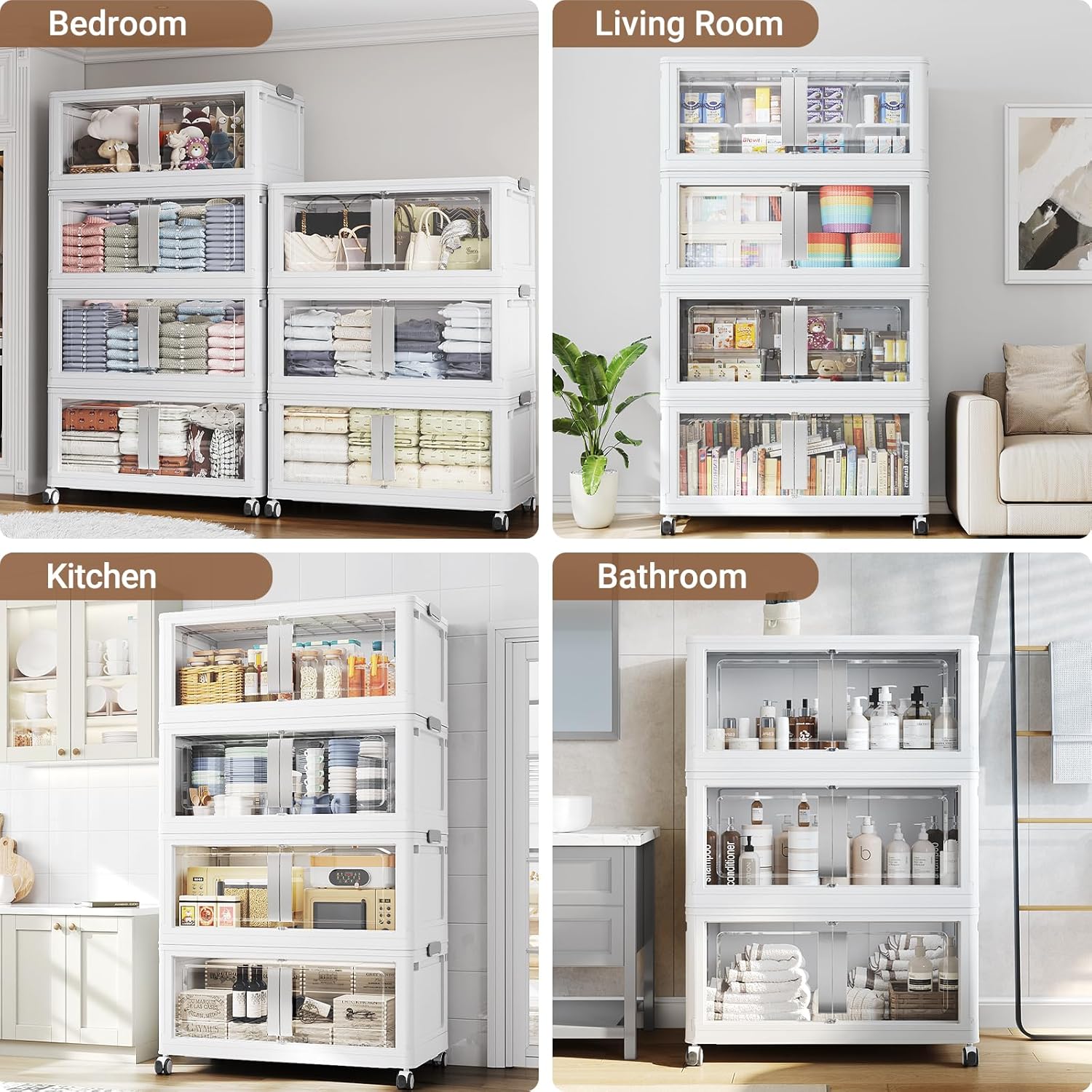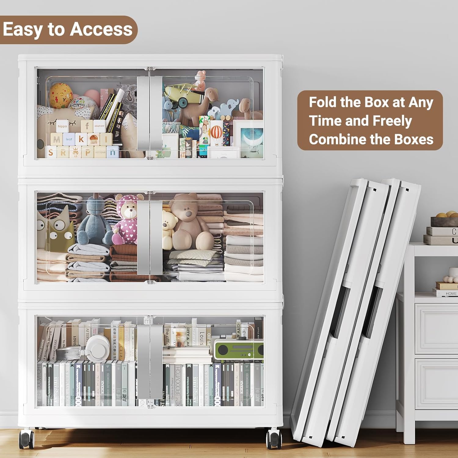 【Super Clear Doors & Ease Access】Stackable storage bins with doors open front features super clear PET doors for instant content viewing at a glance. Enjoy effortless one-handed access with the oversized ergonomic handle and secure magnetic closure. Sleek and modern folding storage bins with lids seamlessly complements any contemporary home decor