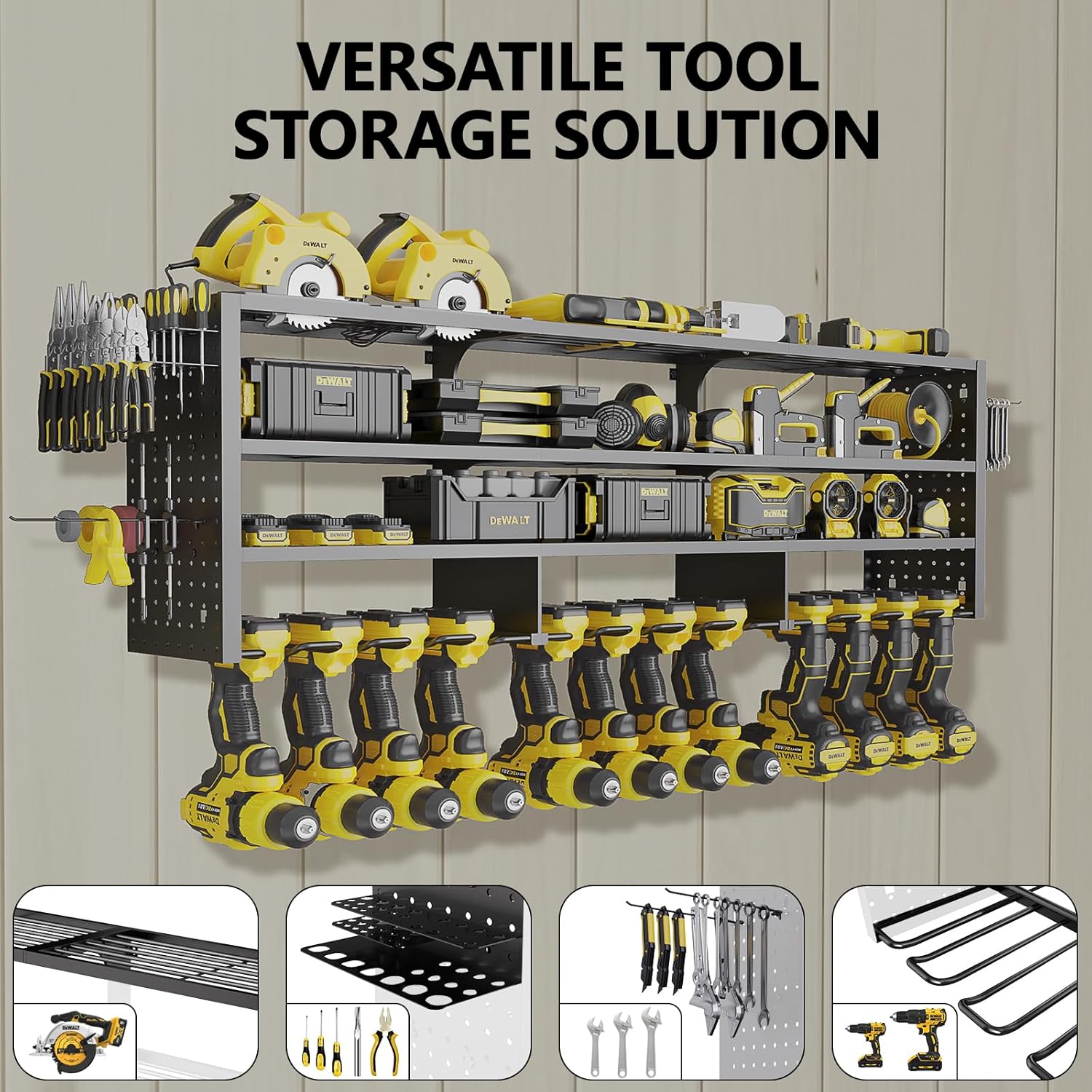 Universal Compatibility, Lifetime Durability: Installs on all 16″ stud walls (pegboard/tile/concrete). Precisely engineered for DeWalt, Milwaukee, RYOBI tools. Your eternal garage partner.