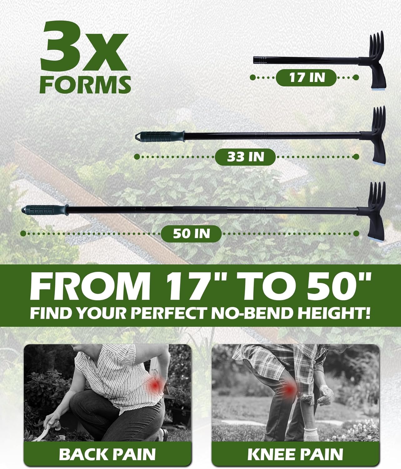 5-in-1 Garden Hoe – Adjustable 37″ to 50″ Handle, 5 Tool Heads, Heavy-Duty Weeding, Cultivating, and Raking Tool for Gardening, Camping, and Outdoor Use