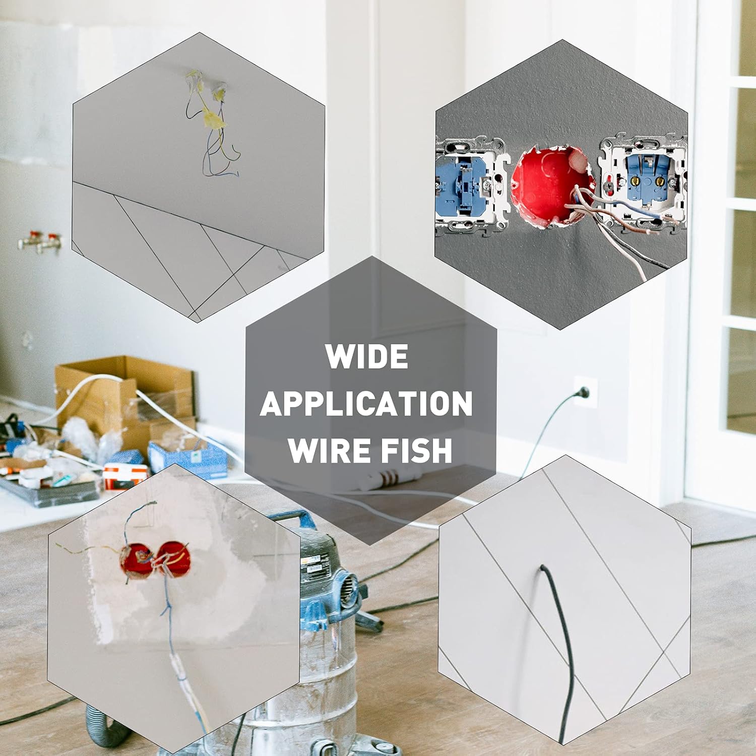 More Advantages Wire Pulling Tools: The fiberglass fish tape set is Strong flexibility and will not break when folded (But do not bend too forcibly while using!). Attached fish tape fastener can prevent casing wear and reduce wire wear, fish ball chain helps fish wires to operate the wiring through interior hollow & narrow & unclear walls with ease, flexible copper leader makes pulling or pushing flat steel tapes easier