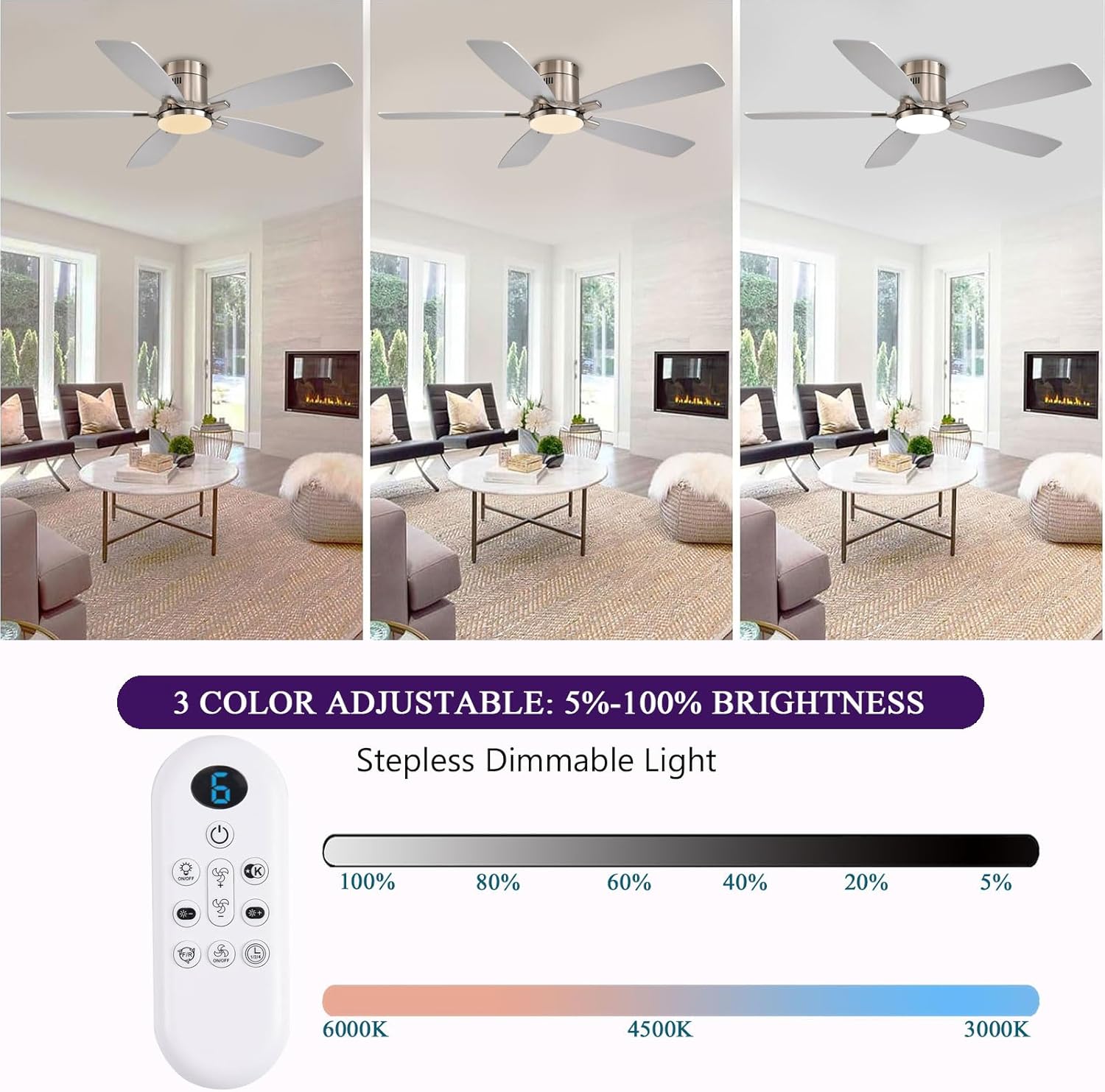 【​​Dimmable Smart Ceiling Fan with Eye-Care Lighting & Energy-Efficient LED System】Features a 30W dimmable LED light (5%-100% stepless dimming) with 3 color temperatures (3000K/4000K/6500K ), ideal for party ambiance, task lighting, or bedtime reading. Energy-saving LED technology consumes 80% less power than incandescent bulbs, with 50,000-hour lifespan and flicker-free illumination for reduced eye strain.