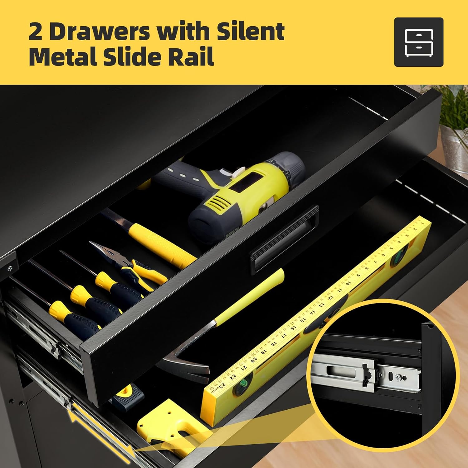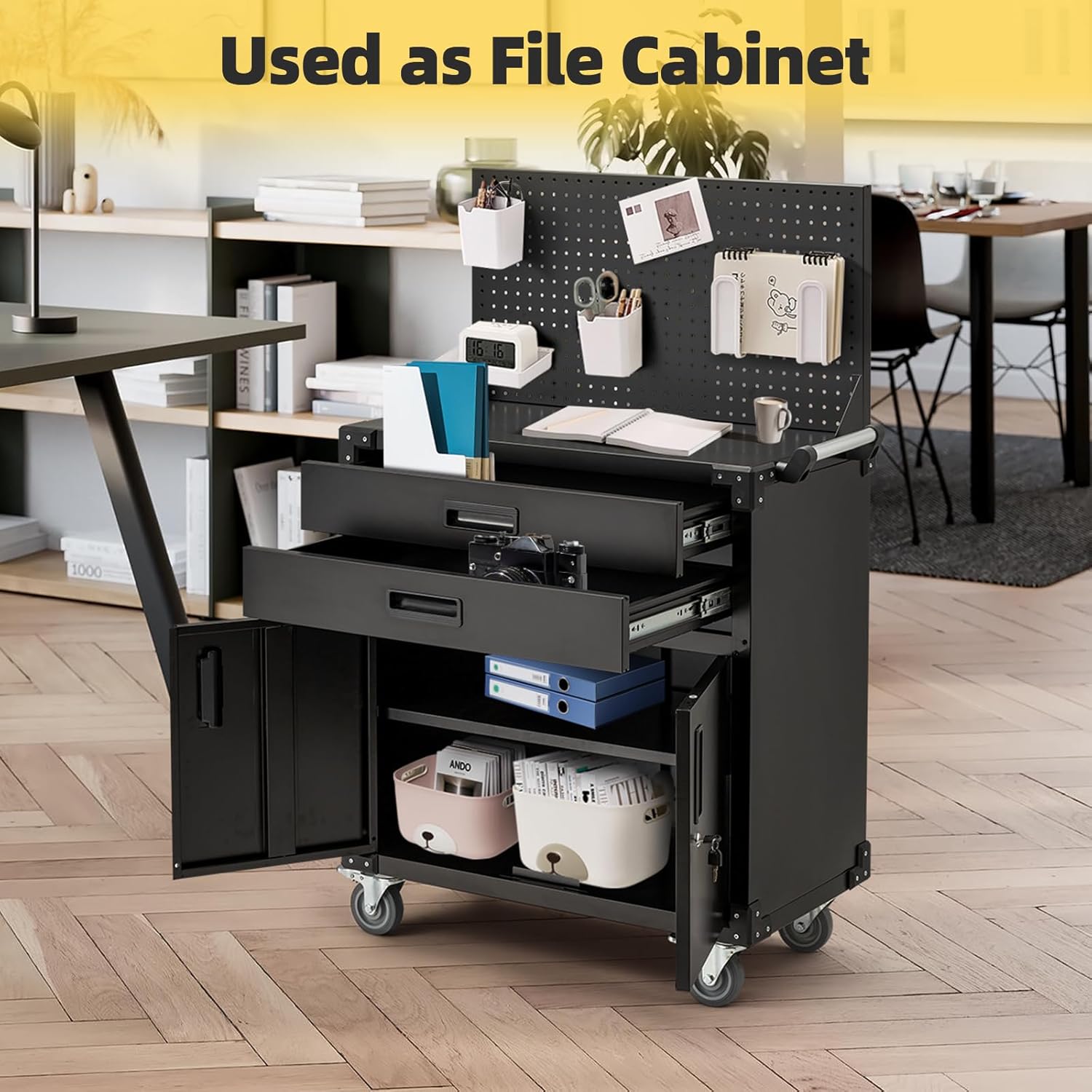 Versatile: this is not only a work bench for garage, but can be used in many occassions for organizer and storage.It could be put in the kitchen for tablewares,food,kitchen appliance, and also could be used as a file cabinet in the office. The black would match all decoration style.