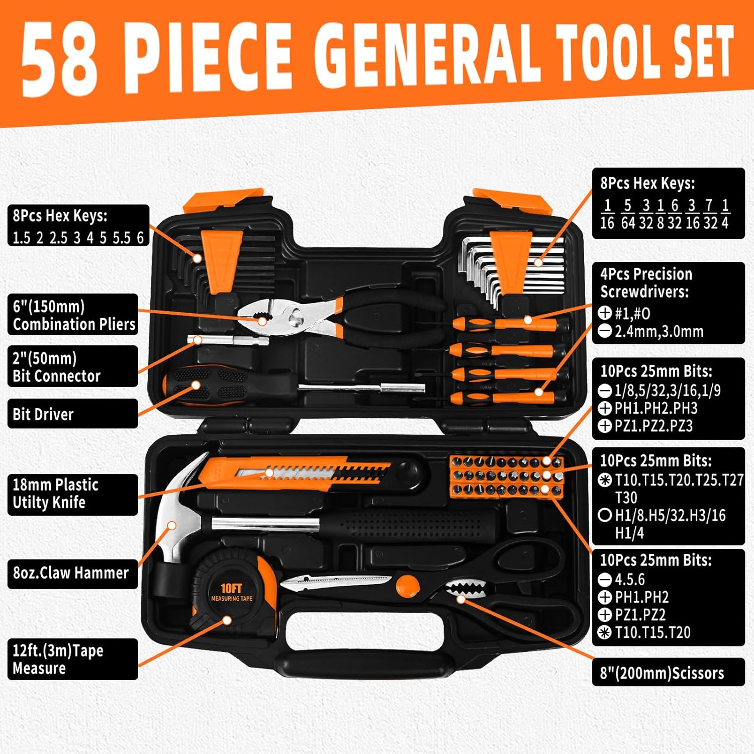 58-Piece Tool Kit Basic Home Repair Tool Set, General Household Hand Tool Kit,Small Tool Kit with Plastic Toolbox Mini Tool kit for Women, Office & College Repairs Orange