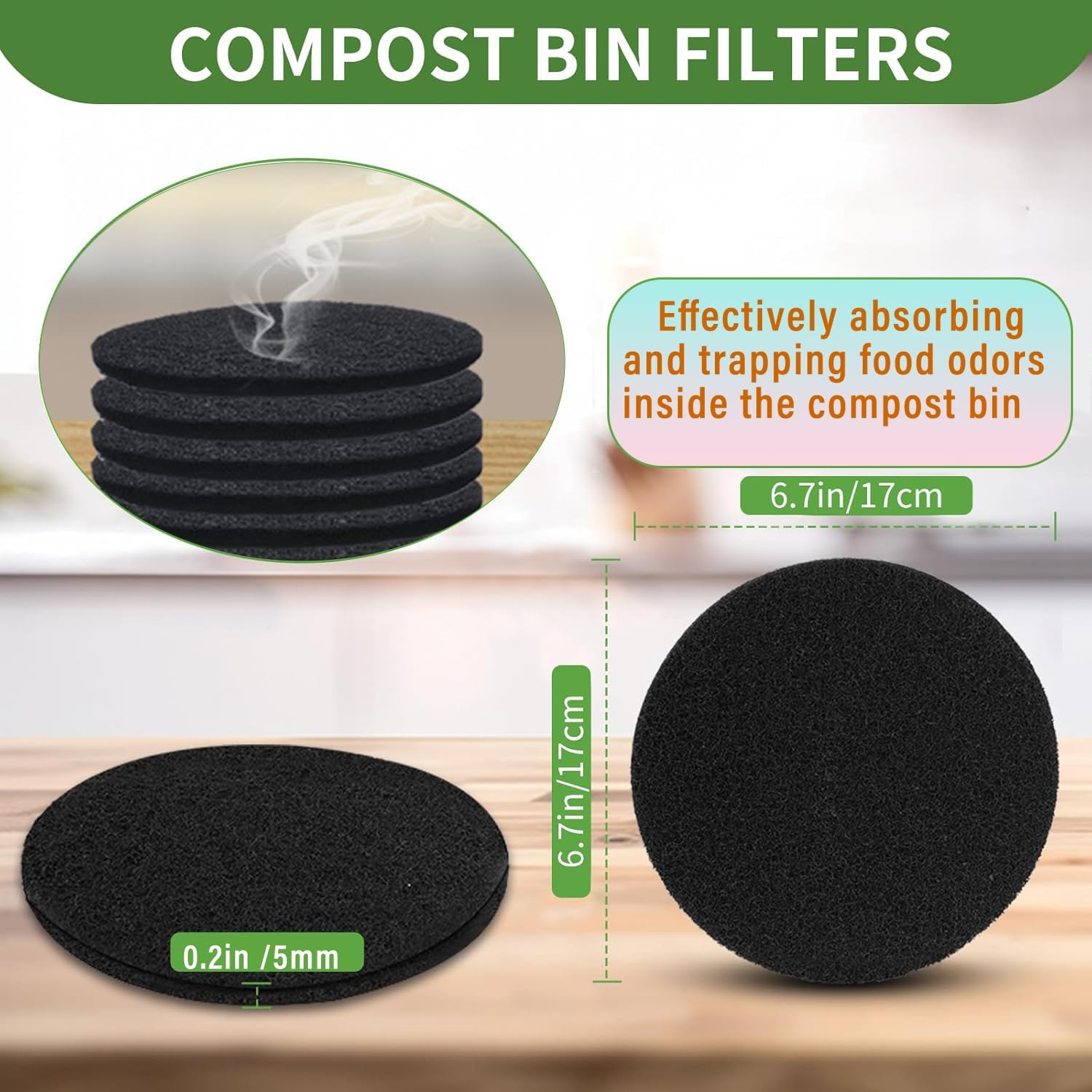 【Effective Odor Blocking Charcoal Filters】Set of 6pcs carbon filters are made of premium activated charcoal material, about 8mm(0.3 inch) thickness , with a leading 20-micron particle size, absorbs and traps food odor inside the composter bins, keeping your kitchen smelling fresh and clean.