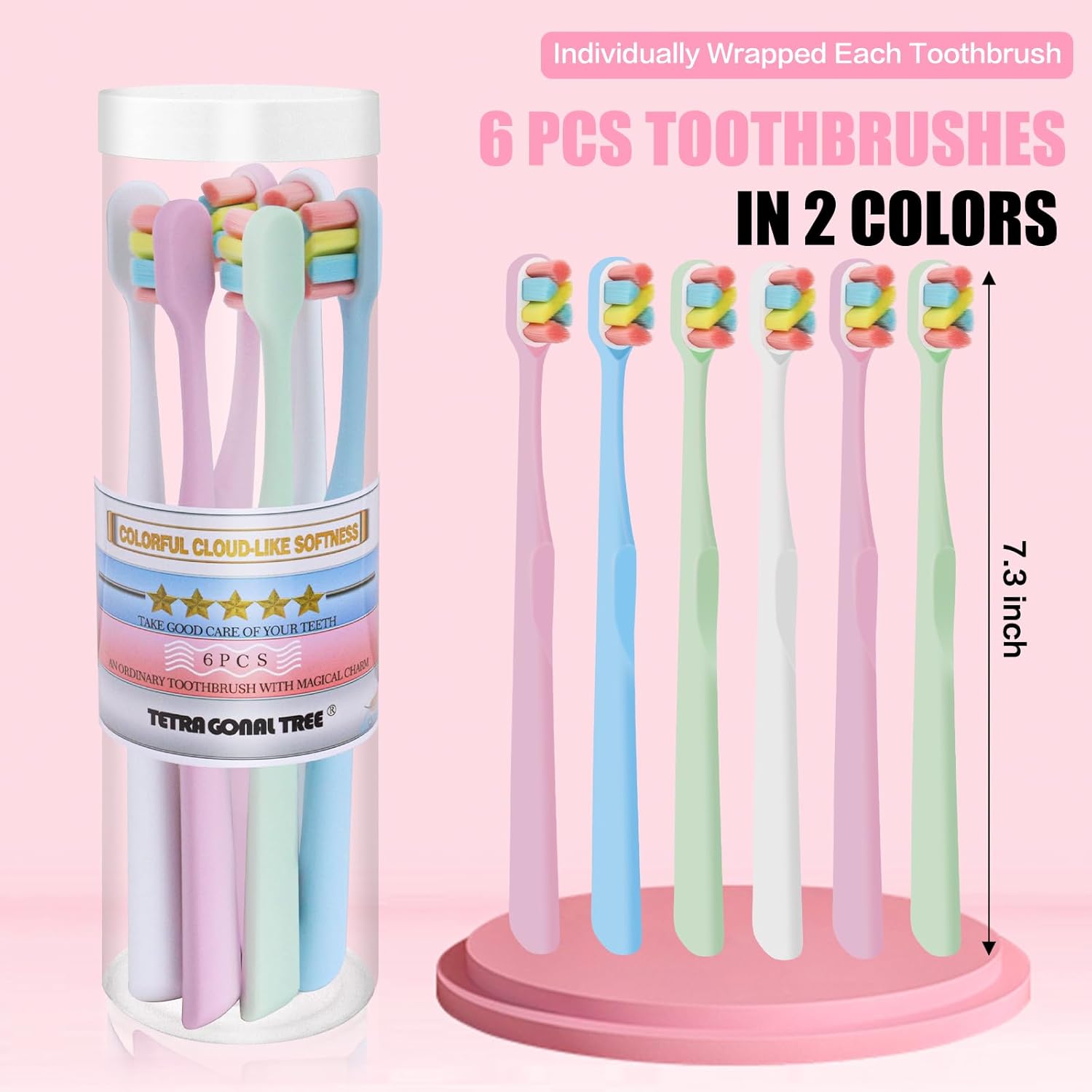 DENTIST APPROVED & CONVENIENT PACKAGING: Endorsed by dental experts, our Extra Soft Toothbrushes utilize advanced microfine technology and come in a convenient storage bucket containing 6 toothbrushes in various colors, ensuring hygiene and easy organization in your bathroom.