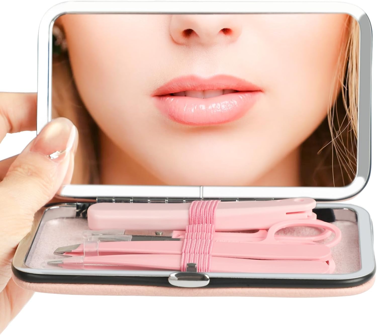 6-in-1 Eyebrow Kit with Leather Mirror Case | Trimmer Eyebrow Scissors, Tweezers, Razor & Spoolie Brush for Women Men (Pink)