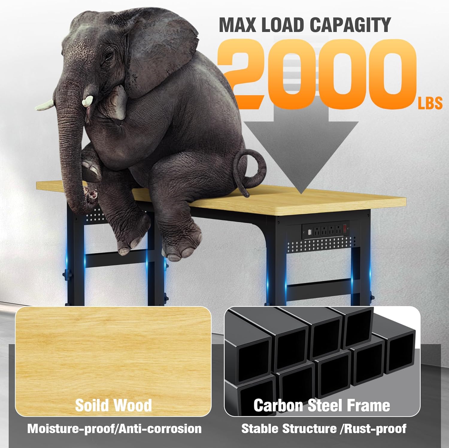 Heavy-Duty and Durable Construction: The table top of this heavy duty workbench is made of solid wood and finely polished to prevent cracking, the legs and additional support rods are made of reinforced carbon steel with a weight capacity of over 2000 lbs
