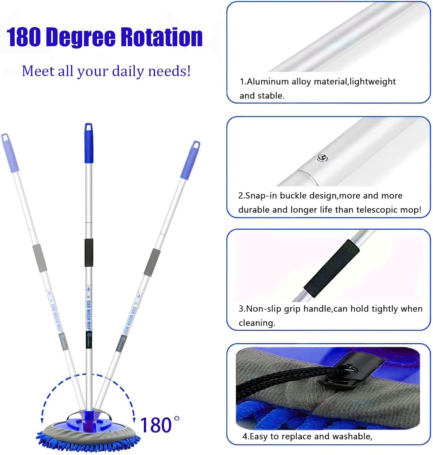 【Car Wash Mop With 62 inch Super-Long Handle】- Super-Long car wash mop will help you to clean the different height place where you can not reach by hand as the roof of the car. The car wash mop is made of aluminum alloy, which is harder than stainless steel, is lighter and has a longer lifespan! It can be extended to 62 inch, which ensures you can easily do a full cleaning.